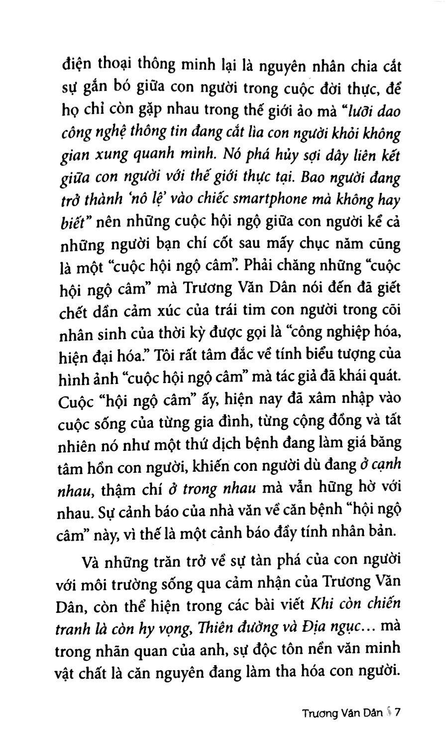 Hy vọng, đọc tác phẩm này các bạn sẽ chia sẻ với những vấn đề tác giả nói đến trong cõi nhân sinh và tìm được cho mình “một cõi đi về”. Đó là cõi đi về phía ánh sáng của tình yêu thương, lòng nhân ái và sự hướng thiện, vốn là những giá trị hằng cửu mà những tác phẩm văn học đích thực mang đến cho con người. Milano Sài Gòn, đang về hay sang? của Trương Văn Dân là một tác phẩm văn chương như thế mà tôi muốn chia sẻ như một người đọc tri âm .