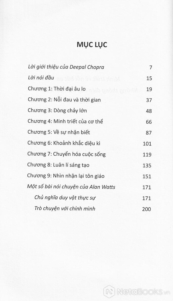 Minh Triết Về Nỗi Bất An - Một Thông Điệp Cho Thời Đại Đầy Lo Âu Mỗi cuốn sách là một hành trình, nhưng cuốn sách này là một hành trình miên viễn, đi đến mọi nơi và cũng không hề đến đíốn sách mở đầu bằng những đề cập đến trạng thái âu lo mà hầu hết đều ai cũng muốn né tránh. Nó làm gẫy rạn niềm tn phổ biến,nói đến những điều được coi là thiêng liêng với thái độ bất kính và mỉa mai. Giống như muốn chuốc lấy thất bại, Alan Wats còn đề xuất một điều tưởng chừng như nghịch lí rằng: Nỗi bất an vừa là một dạng tâm bệnh vừa là một cánh cửa dẫn lối đến một thực tại vô hình, đó là cũng là nơi duy nhất có chứa những phương thuốc chữa lành cho nỗi sợ hãi và bất an.