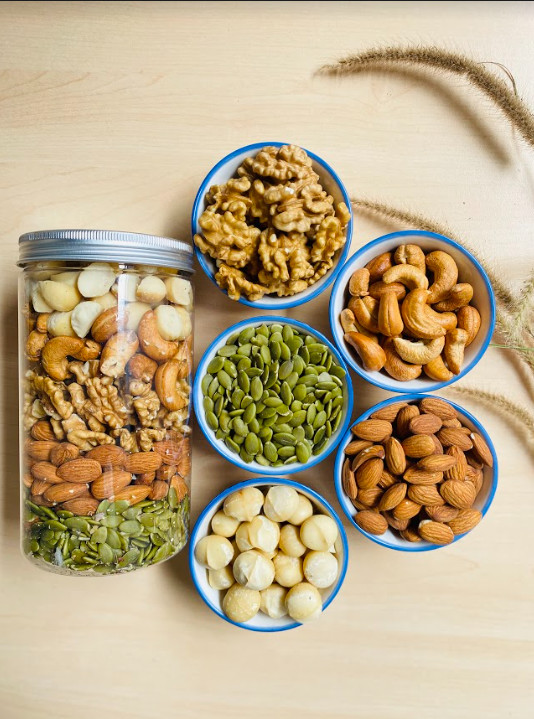 Mix hạt dinh dưỡng ăn liền tại Holinut Thành phần: Hạt bí rang, hạnh nhân rang mộc, nhân óc chó vàng, nhân macca, điều tách lụa. Quy cách: hũ/500gram Công dụng của 5 loại hạt mix điều dinh dưỡng:
