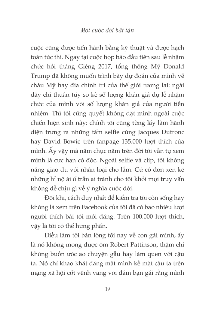 Một cuộc đời bất tận thoạt đầu có vẻ giống như hành trình nghiên cứu cá nhân khá kỳ công về các tiến bộ khoa học có thể cho phép kéo dài tuổi thọ con người trong tương lai để từ đó công khai thái độ của nhân vật kể chuyện với cái chết. Nhưng đằng sau những thông tin khoa học hay di truyền học phức tạp hoặc thú vị ấy lại là màn lột xác bất ngờ và hoàn hảo của “kẻ ích kỷ lãng mạn” Frédéric Beigbeder: gã chơi đêm và đam mê tiệc tùng ngày nào cuối cùng cũng thừa nhận mình đang già đi và ngoan ngoãn vào vai người chồng, người cha tuyệt vời. Mọi kiếm tìm bất tử rốt cuộc đều chỉ để được ở gần những người yêu thương càng lâu càng tốt.