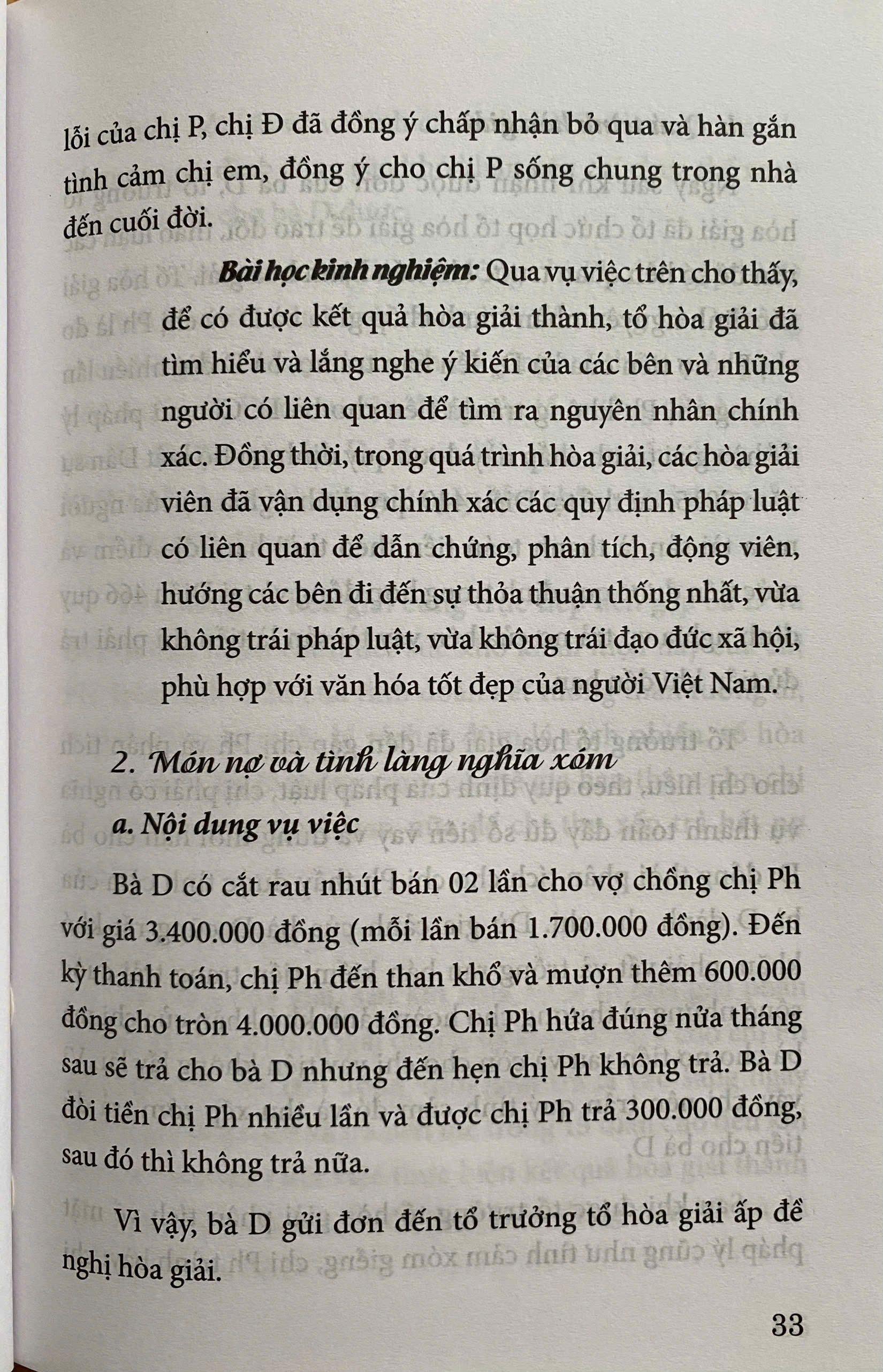 Việc hòa giải các mâu thuẫn, tranh chấp, vi phạm pháp luật trong cộng đồng đã góp phần quan trọng trong việc giữ gìn an ninh trật tự, an toàn xã hội, phòng ngừa vi phạm pháp luật và tội phạm; hạn chế đơn thư, khiếu kiện, tiết kiệm thời gian và tiền bạc của cơ quan nhà nước và nhân dân, đồng thời thông qua quá trình hòa giải đã góp phần truyền bá, hình thành trong mỗi công dân ý thức thượng tôn pháp luật....Luatvietbook xin trân trọng mời bạn tham khảo cuốn sách " MỘT SỐ VỤ VIỆC ĐIỂN HÌNH TRONG CÔNG TÁC HOÀ GIẢI Ở CƠ SỞ" Nội dung cuốn sách gồm các vụ việc như sau