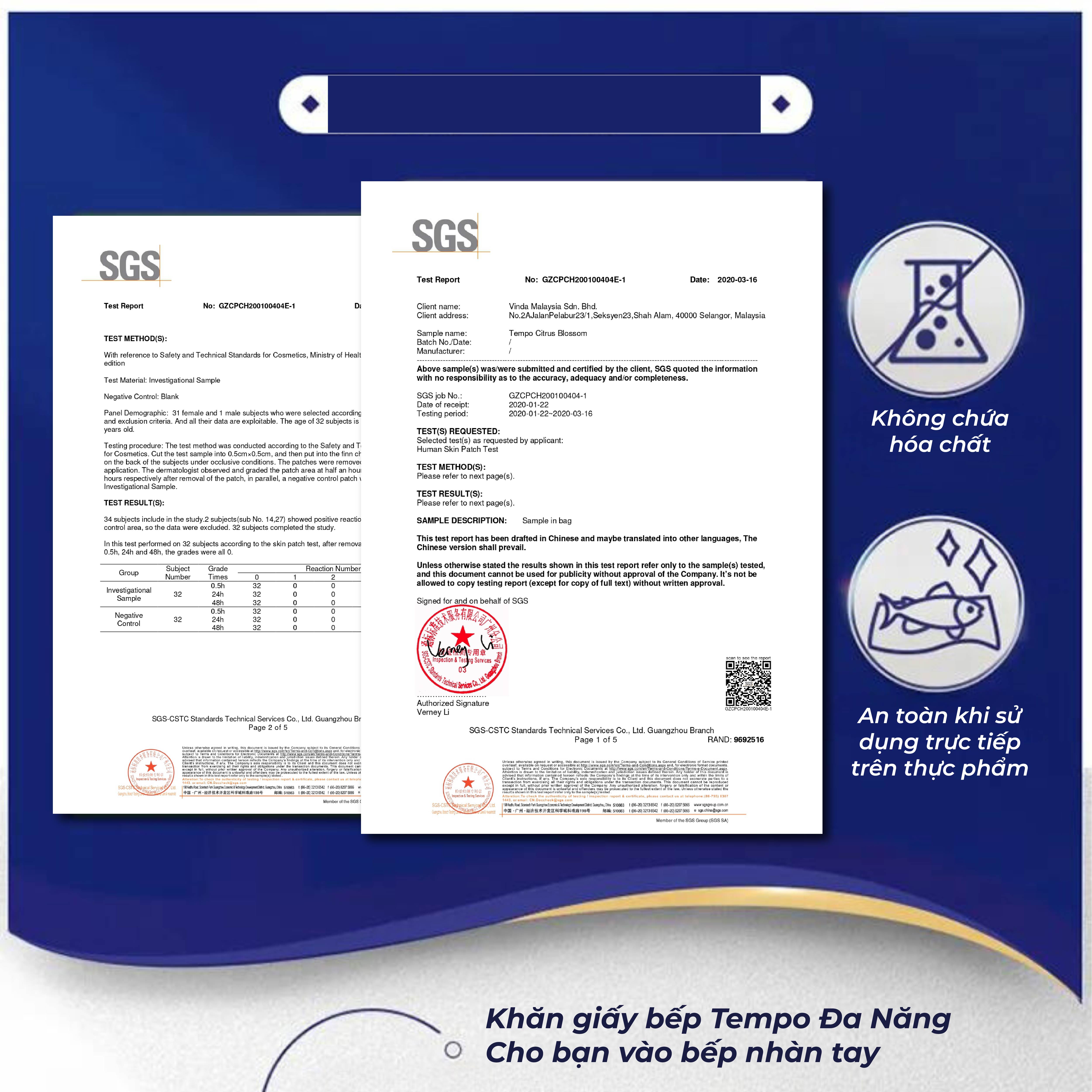 MUA 1 LỐC KHĂN GIẤY BẾP CUỘN TẶNG 1 GÓI KHĂN GIẤY BẾP DẠNG RÚT Khăn giấy bếp đa năng siêu thấm Tempo (4 Cuộn) Thương Hiệu Đức   ** TEMPO là thương hiệu khăn giấy cao cấp của Đức từ năm 1929. Với chất lượng và công nghệ vượt trội, Tempo đang chiếm lĩnh vị trí số 1 tại thị trường Đức, Ý, Thụy Sỹ... Tempo là thương hiệu khăn giấy được yêu thích và tin dùng tại nhiều quốc gia trên thế giới, đặc biệt là Châu Âu và Châu Á. Được sản xuất theo công thức cải tiến mới và nguyên liệu tự nhiên đạt chuẩn Châu Âu, khăn giấy bếp đa năng siêu thấm Tempo đa năng, chất lượng giấy dày và bền dai hơn giúp thấm hút dầu thừa, nước vượt trội, tiện lợi dễ xé.   *ĐẶC ĐIỂM NỔI BẬT: + Công nghệ Fabric Air thấm hút vượt trội, bền dai + Khăn giấy 3 lớp + Bền dai khi ướt + Đạt 5 giấy chứng nhận VSATTP: FDA, ISO, LFGB, EDQM, GB + Tiện lợi, vệ sinh , dễ xé + Hoa văn dập nổi tinh tế trên từng lớp giấy + 100% bột gỗ giấy nguyên sinh, không bụi giấy   Khăn giấy bếp đa năng siêu thấm dạng gói với 3 lớp giấy cao cấp, không chứa chất độc hại, đặc biệt an toàn cho thực phẩm, mang đến bạn cảm giác thực sự yên tâm khi sử dụng. Với thiết kế dạng gói rút tiện lợi, khăn giấy bếp đa năng siêu thấm Tempo đa năng dễ dàng và phù hợp sử dụng cho các sinh hoạt hằng ngày.   *THÀNH PHẦN NGUYÊN LIỆU: Được làm 100% từ bột gỗ giấy nguyên sinh.   *Hướng dẫn sử dụng: Khăn giấy bếp đa năng siêu thấm dùng vệ sinh trong khu bếp và các sinh hoạt hằng ngày.   *Hướng dẫn bảo quản: Để nơi thoáng mát và tránh ánh nắng mặt trời.   *Cảnh báo an toàn sức khỏe: Không được ăn và tránh xa tầm tay trẻ em. *Quy cách đóng gói:  Số lượng: 4 cuộn/ lốc. Số lớp: 3 lớp/ tờ. Định lượng của 1 lớp giấy: 20,0 ± 1,0 g/m2. Kích thước: (112 mm x 224 mm) ± 3%.  *Ngày sản xuất: in trên gói theo năm/tháng/ngày. *Hạn sử dụng: 3 năm kể từ ngày sản xuất   *Sản phẩm an toàn với các tiêu chuẩn: + FDA: Tuân thủ theo tiêu chuẩn Quản lý Thực phẩm và Dược phẩm Hoa Kỳ  + ISO: Nhà máy tuân thủ hệ thống quản lý an toàn thực phẩm ISO 22000  + Không sử dụng chất làm trắng huỳnh quang     #khangiay #khangiayrut #khangiaybich #khangiaykho #khangiaycaocap #khangiaybichcaocap #khangiaytempo #khangiaytempocaocap #khangiayTempoSoftPack #giaytempo #khangiayruttempo #tempo #khangiay4lop #khangiayantoanchoda #khangiaylau #khangiaythuonghieuduc #khangiaynhapkhau #khangiaythom #giayan #giaybep #giaydanang