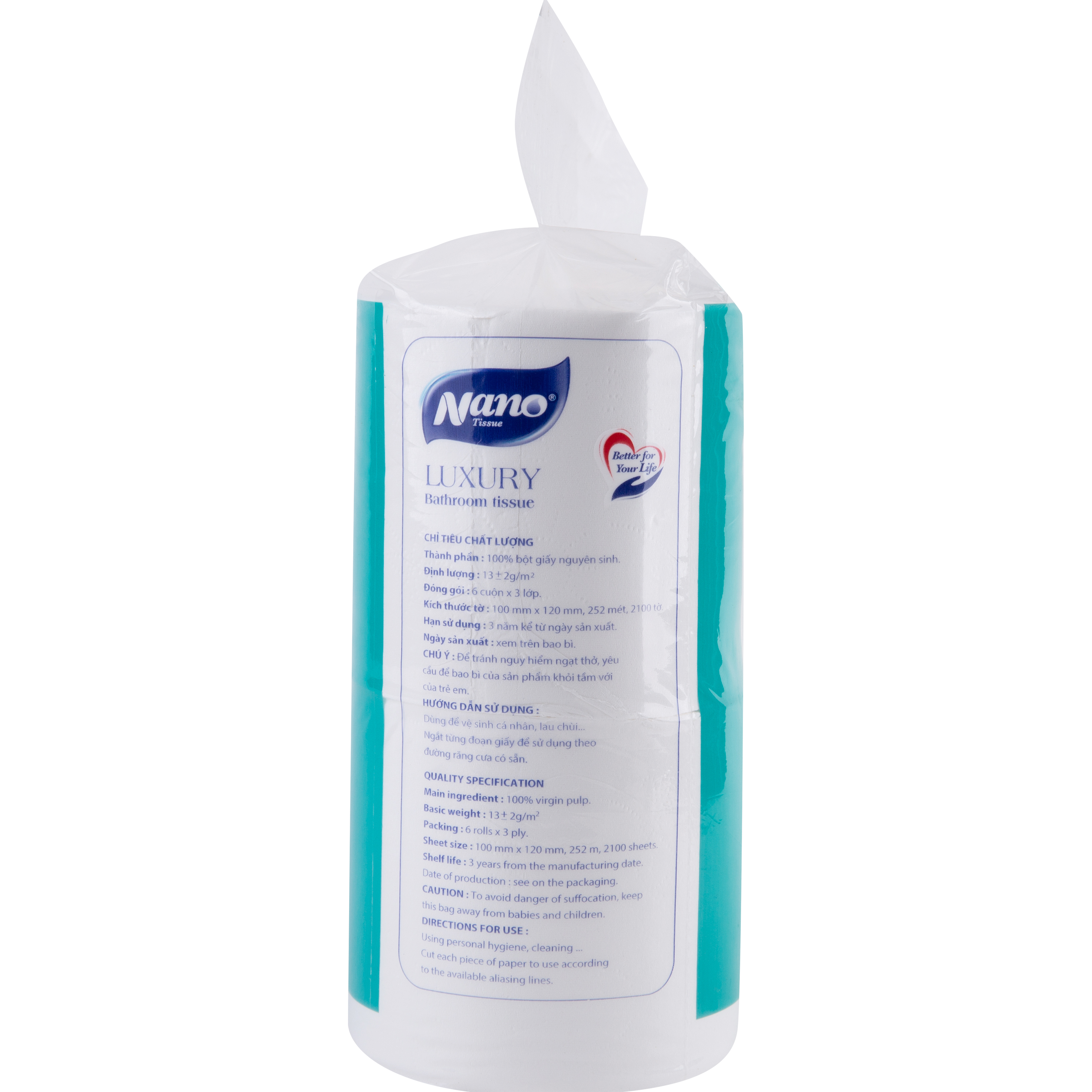 Mô tả sản phẩm Giấy vệ sinh cao cấp Nano được sản xuất với dây chuyền sản xuất khép kín và hiện đại đạt tiêu chuẩn an toàn. Giấy Vệ Sinh cao cấp Nano (6 Cuộn x 3 Lớp) được làm bằng 100 % bột giấy nguyên sinh, không chứa các hóa chất độc hại, không gây kích ứng da, đảm bảo an toàn tuyệt đối cho người dùng. Sản phẩm có độ dai, mềm và khả năng thấm hút nước cao, mang lại sự thoải mái và yên tâm tuyệt đối khi sử dụng, đặc biệt dễ chịu khi tiếp xúc với làn da. Sản phẩm hoàn toàn không có hóa chất tẩy trắng độc hại, sử dụng được với nhiều mục đích khác nhau. Với thiết kế dạng cuộn có lõi giúp bạn dễ dàng cài vào móc đựng giấy vệ sinh, mang lại sự tiện lợi khi sử dụng, đáp ứng tối đa nhu cầu đa dạng và ngày càng khắt khe của người tiêu dùng