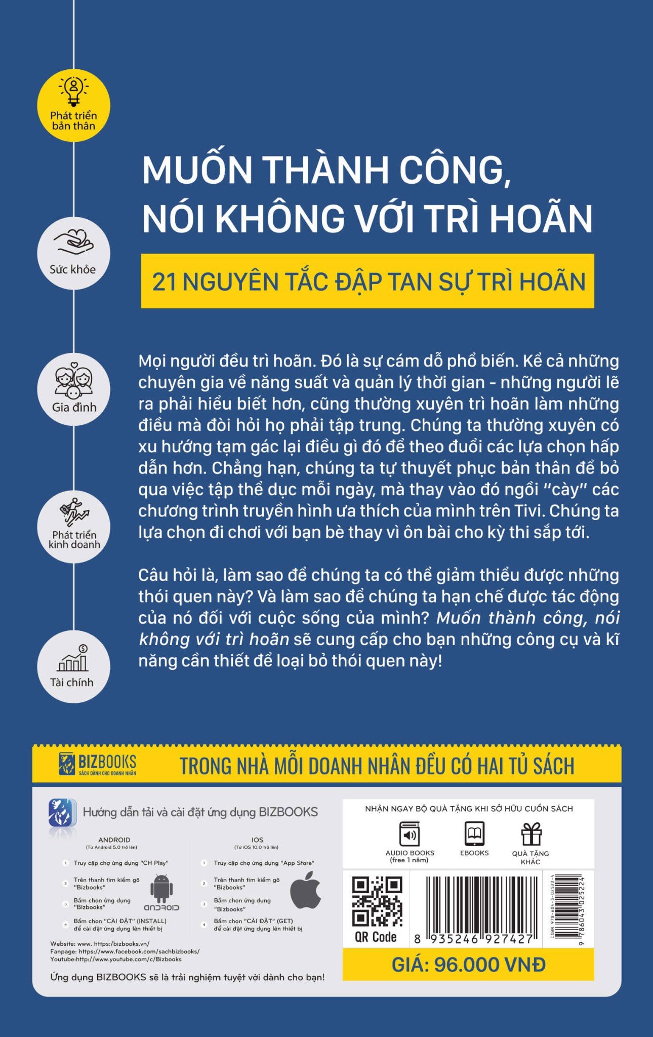 Bất kỳ lý do thuyết phụ nào cũng là vô ích, và hoàn thành là điểm đến cuối cùng. Tìm kiếm thêm lý do, mọi thứ sẽ không có tiến triển gì, tìm kiếm 10.000 lý do không tốt bằng thực hiện từng bước – 21 nguyên tắc vàng đập tan sự trì hoãn giúp bạn có thêm thời gian, gia tăng cơ hội và tiến tới đích thần tốc. Hãy nhớ cách bạn đối xử với cuộc sống và cách cuộc sống đối xử với bạn. Đừng để sự trì hoãn kéo chân bạn lại. Hãy đọc ngay cuốn sách – 21 nguyên tắc vàng đập tan sự trì hoãn nếu bạn cần ngay một LIỀU VITAMIN ĐỘNG LỰC VÀ ĐẬP TAN SỰ TRÌ HOÃN. Cơ hội để bạn sử dụng thời gian hiệu quả, trân trọng giới thiệu đến bạn cuốn sách: Muốn thành công nói không với trì hoãn – 21 nguyên tắc vàng đập tan sự trì hoãn. Thời gian là một chủ nhân mang đến cơ hội bình đẳng. Mỗi người đều có chính xác cùng một số giờ và phút mỗi ngày. Người giàu không thể mua thêm giờ. Các nhà khoa học không thể phát minh ra phút mới. Và bạn không thể tiết kiệm thời gian để chi tiêu nó vào một ngày khác. Mặc dù vậy, thời gian cũng rất công bằng và vị tha. Cho dù bạn đã lãng phí bao nhiêu thời gian trong quá khứ, bạn vẫn có toàn bộ ngày mai. Có gì trong cuốn sách Muốn thành công nói không với trì hoãn? Cuốn sách đưa ra những nguyên nhân của sự trì hoãn và cách giải quyết rất thực tiễn dựa vào những trải nghiệm mà tác giả và những người mà ông nghiên cứu. Muốn đạt được mục tiêu, bạn phải biết hành động thành thói quen thường ngày. Lựa chọn một mục tiêu trong danh sách của bạn, biến nó thành hành động và thực hiện điều đó hàng ngày. Thói quen đó có thể làm viết blog, thiền, chạy bộ, học hỏi, tùy theo sở thích của bạn. Chứa đầy những thủ thuật hành động để giúp bạn vượt qua thói quen trì hoãn trong cuộc sống và công việc, sự nghiệp. Ví dụ như: Hãy ĂN CON CÓC TRƯỚC - trước tiên hãy làm công việc khó khăn và quan trọng nhất ngay khi bạn thức giấc. Những công việc không hấp dẫn chính là "con cóc". Đó là những công việc và dự án mà bạn không hề có động lực để làm. Chúng lơ lửng trên đầu bạn như đám mây đen cho đến khi bạn xử lý xong. Bạn càng trì hoãn bao lâu thì nó càng khiến bạn căng thẳng bấy nhiêu. Bạn sẽ thấy chật vật trong vài ngày đầu tiên. Thế nhưng, một khi đã vào guồng, bạn sẽ thấy thói quen đó sẽ trở thành một phần không thể thiếu của bạn. Hãy cố gắng nỗ lực trong vòng ít nhất là 21 ngày, dù chỉ có 20 phút mỗi ngày để thực hiện điều đó. Bạn sẽ thấy điều diệu kỳ.