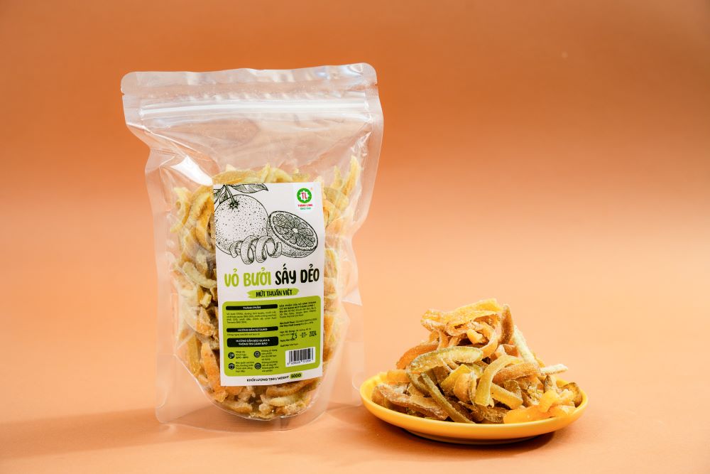 SẢN PHẨM CỦA  HỘ KINH DOANH  CƠ SỞ  BÁNH MỨT THÀNH LONG 1 VỎ BƯỞI SẤY DẺO Mứt Thuần Việt THÀNH PHẦN : Vỏ Bưởi (70%), đường tinh luyện, muối i-ốt, chất bảo quản (E202), chất chống oxy hóa (E223), chất điều chỉnh độ acid: Acid Tartaric (E334) SẢN XUẤT THEO: 02/HKDCSBMTL1/2021 THỜI HẠN SỬ DỤNG : 06 Tháng kể từ ngày sản xuất CHỈ TIÊU CHẤT LƯỢNG : ĐỘ ẨM ≤ 35% HƯỚNG DẪN SỬ DỤNG VÀ BẢO QUẢN: HƯỚNG DẪN BẢO QUẢN: BẢO QUẢN NƠI KHÔ RÁO, THOÁNG MÁT. TRÁNH ÁNH NẮNG TRỰC TIẾP. NHIỆT ĐỘ THÍCH HỢP: 220C-300C HƯỚNG DẪN SỬ DỤNG: DÙNG NGAY SAU KHI MỞ BAO BÌ. THÔNG TIN CẢNH BÁO: KHÔNG SỬ DỤNG SẢN PHẨM KHI ĐÃ HẾT HẠN SỬ DỤNG GIẤY CHỨNG NHẬN HACCP SỐ 21.4256 – HACCP/VC  DO TRUNG TÂM GIÁM ĐỊNH VÀ CHỨNG NHẬN HỢP CHUẨN HỢP QUY VIETCERT ĐÁNH GIÁ CHỨNG NHẬN PHÙ HỢP TIÊU CHUẨN BAO BÌ SẢN PHẨM THAY DỔI THEO TỪNG LÔ HÀNG.
