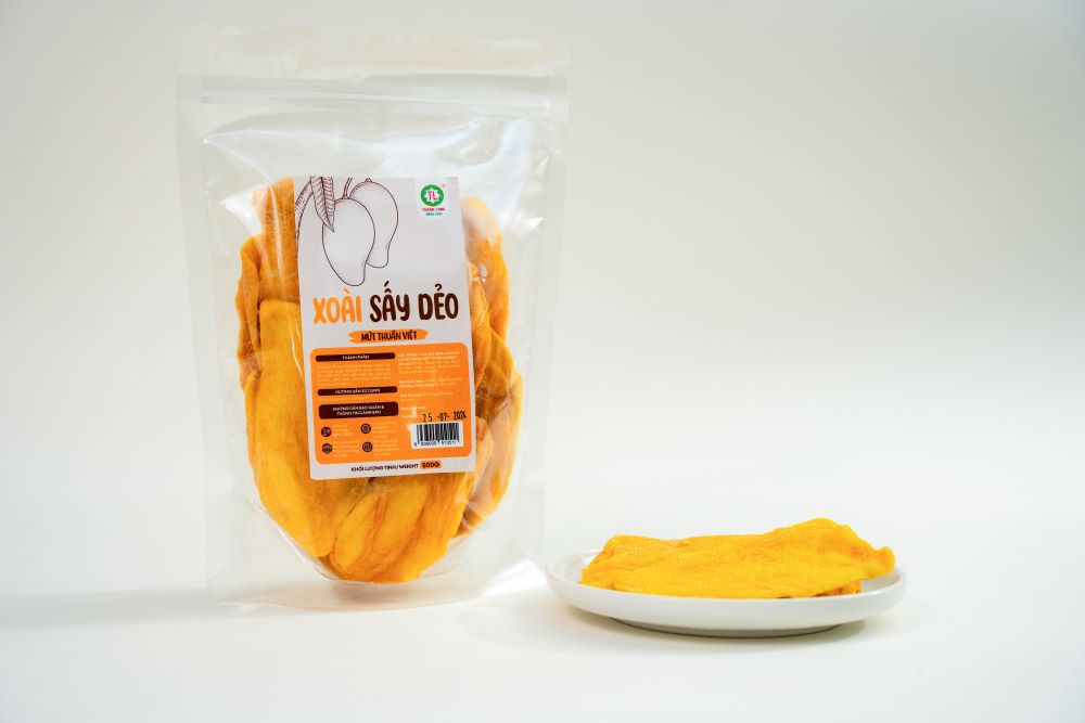 SẢN PHẨM CỦA HỘ KINH DOANH CƠ SỞ BÁNH MỨT THÀNH LONG 1 XOÀI SẤY DẺO Mứt Thuần Việt THÀNH PHẦN : : Trái xoài (80%), đường tinh luyện, muối i-ốt, chất bảo quản (E202), chất chống oxy hóa (E223), chất điều chỉnh độ acid: Acid tartaric (E334), màu thực phẩm tổng hợp: Sunset Yellow SẢN XUẤT THEO: 01/HKDCSBMTL1/2021 THỜI HẠN SỬ DỤNG : 06 Tháng kể từ ngày sản xuất CHỈ TIÊU CHẤT LƯỢNG : ĐỘ ẨM ≤ 35% HƯỚNG DẪN SỬ DỤNG VÀ BẢO QUẢN: HƯỚNG DẪN BẢO QUẢN: BẢO QUẢN NƠI KHÔ RÁO, THOÁNG MÁT. TRÁNH ÁNH NẮNG TRỰC TIẾP. NHIỆT ĐỘ THÍCH HỢP: 22 ĐỘ C-30 ĐỘ C HƯỚNG DẪN SỬ DỤNG: DÙNG NGAY SAU KHI MỞ BAO BÌ. THÔNG TIN CẢNH BÁO: KHÔNG SỬ DỤNG SẢN PHẨM KHI ĐÃ HẾT HẠN SỬ DỤNG GIẤY CHỨNG NHẬN HACCP SỐ 21.4256 – HACCP/VC DO TRUNG TÂM GIÁM ĐỊNH VÀ CHỨNG NHẬN HỢP CHUẨN HỢP QUY VIETCERT ĐÁNH GIÁ CHỨNG NHẬN PHÙ HỢP TIÊU CHUẨN Chi tiết mẫu mã bao bì sản phẩm thay đổi theo từng lô hàng.