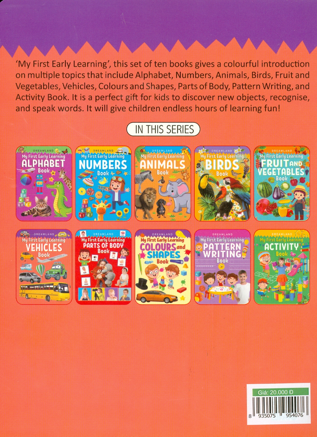 'My First Early Learning' gồm 10 cuốn sách:- Bảng chữ cái, Số, Động vật, Chim, Trái cây và Rau củ, Màu sắc và Hình dạng, Các bộ phận của Cơ thể, Viết theo Mẫu và Hoạt động. Bộ sách vui nhộn và mang tính giáo dục với những hình ảnh dễ thương sống động này là sự lựa chọn tốt nhất cho trẻ em.