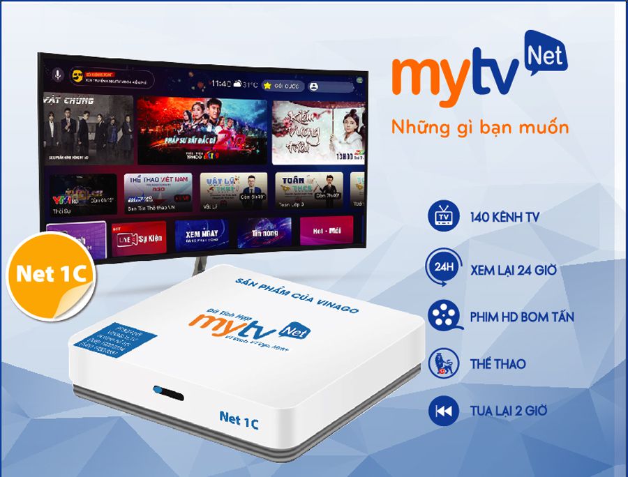 ANDROID MYTV NET PHIÊN BẢN 1C MỚI NHẤT NĂM 2021 RAM 2G, ROM 16G  ĐẶC ĐIỂM NỔI BẬT Đây là một sản phẩm hợp tác giữa công ty TNHH Phân Phối Công Nghệ Và Dịch Vụ Mới Rồng Việt (VINAGO) với Công ty Phát Triển Dịch vụ Truyền Hình MyTV – Chi nhánh Tổng Công Ty Truyền Thông, với sự kết hợp tối ưu giúp chiếc Android Tv Box Mytvnet Net 1C có một vài lợi thế đặc biệt so với các sản phẩm Android Box thông thường khác trên thị trường như sau: Về phần cứng và cấu hình, chiếc box Mytv Net 1 được trang bị cấu hình khá tân tiến hiện nay rất phù hợp với nhu cầu giải trí cơ bản và xem truyền hình, xem youtube trực tuyến. – Mytvnet Net 1C trang bị chip xử lý Amlogic S905l, dòng chip mới được tung ra thị trường khẳng định về chất lượng và độ ổn định, ấn tượng với chất lượng hình ảnh đẹp, độ nét cao và hình ảnh trong, có chiều sâu trung thực hơn hẳn với các chip android box thông thường khác. Độ phẩn giải lên tới 4K sắc nét và hệ điều hành Android 9.0. – Với Cấu hình mạnh mẽ ram 2G, rom 16G, chip nhớ eMMC chính hãng Samsung nên tốc độ xử lý của Mytvnet Net 1C nhanh đáng kể, khá thoải mái với các tiện ích giải trí, xem truyền hình, youtube, phim ảnh và lướt web. – Mytvnet đầy đủ tất cả các cổng kết nối cần thiết hiện nay: 02 cổng USB 2.0 01 cổng HDMI 2.0 hỗ trợ 4K 01 cổng AV kết nối tv thường hay dàn loa 2 kênh 01 cổng LAN RJ45 giúp bạn cắm lan trực tiếp nếu k có wifi 01 khe cắm thẻ nhớ TF card giúp mở rộng khả năng lưu trữ Về phần mềm và tiện ích: Chiếc Mytvnet Net 1C được đội ngũ Mytv net đã tối ưu trở thành một box android chuyên dụng giải trí và xem truyền hình dễ dàng và tiện ích: Xem truyền hình dễ dàng, khi khởi động thiết bị sẽ tự động mở truyền hình và kênh truyền hình bạn xem gần nhất. Điều khiển chọn kênh dễ dàng bằng điều khiển theo máy. Điều khiển theo máy còn có thể mở tắt các ứng dụng: Xem Youtube, Duyệt Web, Xem phim Hdplay. Ngoài ra bạn có thể tua, chuyển bài trên youtube dễ dàng qua điều khiển. – Mytvnet Net 1C tích hợp đầy đủ kho ứng dụng Goolge Play, kho ứng dụng chuyên Android box HDplay Store giúp việc cài đặt các ứng dụng dễ dàng mà không cần đăng nhập tài khoản Google.