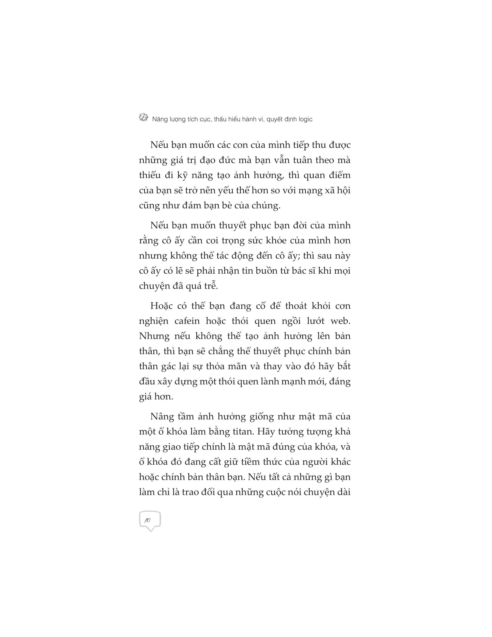 “Năng lượng tích cực, thấu hiểu hành vi, quyết định logic” sẽ giúp bạn hiểu cụ thể hơn về những quy tắc và các bước quan trọng trong việc biến kỹ năng gây ảnh hưởng trở thành thói quen trong cách suy nghĩ cũng như hành động, giúp bạn mở ra cánh cửa thành công trong sự nghiệp và cuộc sống.