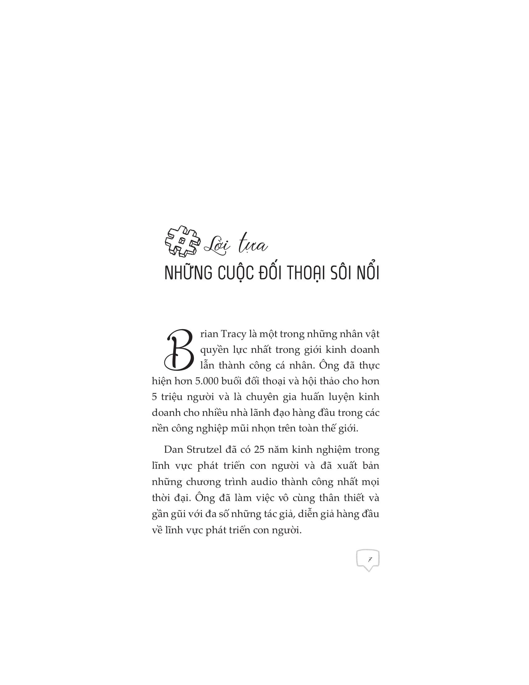 Brian Tracy là một trong những nhân vật quyền lực nhất trong giới kinh doanh lẫn thành công cá nhân. Ông đã thực hiện hơn 5.000 buổi đối thoại và hội thảo cho hơn 5 triệu người và là chuyên gia huấn luyện kinh doanh cho nhiều nhà lãnh đạo hàng đầu trong các nền công nghiệp mũi nhọn trên toàn thế giới.