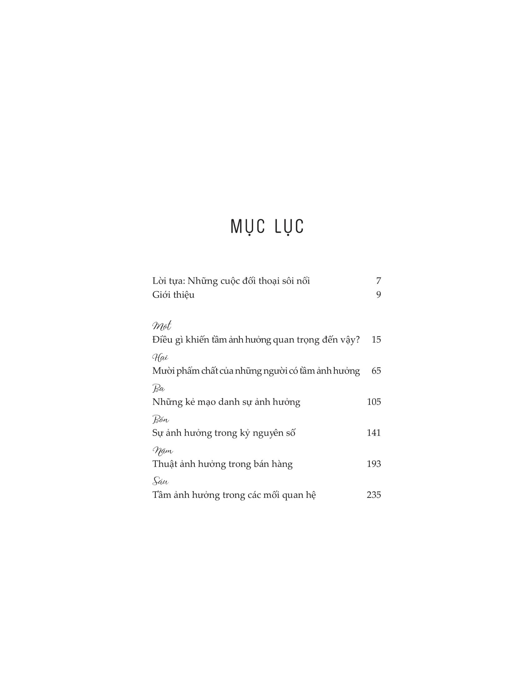 Cuốn sách sẽ bàn về cách phát triển bản thân thông qua những kỹ năng tạo ảnh hưởng, từ đó giúp bạn tạo ra những kết quả đáng kinh ngạc như mối quan hệ cá nhân hạnh phúc hơn, bán hàng tốt hơn, tạo ra những mối quan hệ đối tác có lợi hơn cũng như hoàn thành những mục tiêu quan trọng nhất đối với bạn. Không chỉ dừng lại ở đó, cuốn sách còn giúp bạn thấy rằng thật sự có khoa học về tầm ảnh hưởng, một cơ sở khoa học đã được kiểm định và chứng minh nhiền lần, không phải chỉ trong vài năm hay vài thập kỉ, mà cả nghìn năm nay. Mục tiêu của cuốn sách này là mang đến cho bạn thật nhiều sự thật đã được kiểm chứng về tầm ảnh hưởng, loại bỏ những lời đồn đoán cũng như mớ lý thuyết nửa mùa, và đem đến cho bạn một kho tàng ý tưởng để có thể trở thành nguồn cảm hứng trong chính cuộc đời mình cũng như cuộc đời của những người mà bạn quan tâm.