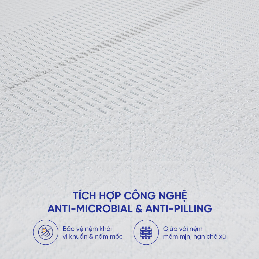 Nệm foam Comfy Cloud 1.0 là sự lựa chọn song hành giữa kinh tế tối thiểu - chất lượng tối ưu dành cho mọi gia đình. Khả năng giảm nhức mỏi và bảo vệ cột sống của  mang đến sự hài lòng cho mọi người nằm. Lợi ích khi sử dụng nệm foam Comfy Cloud 1.0 "Nệm quốc dân" cho mọi cột sống thêm chắc khỏe  phù hợp cho mọi cơ thể nằm mà vẫn bảo đảm cho sức khỏe cột sống tối ưu. Lõi High Resiliance Marble Foam dày gần 12cm có độ đàn hồi cao tương tự như cao su thiên nhiên. Tổng thể cấu trúc vững chãi và êm vừa phải giải phóng áp lực cho các điểm tì nén trên toàn bộ cơ thể. Đồng thời, khả năng nâng đỡ 5 vùng giúp cơ thể cảm nhận được độ cứng/mềm khác nhau cho từng bộ phận Đầu - Vai - Hông - Đầu gối tạo ra sự cân bằng tổng thể trong mọi tư thế nằm, qua đó bảo vệ xương khớp nói chung và cột sống nói riêng, phù hợp với mọi đối tượng nằm.   Thiết kế thoáng & mát dành riêng cho khí hậu nhiệt đới Cloud 1.0 là dòng  thoáng mát tối ưu phù hợp với khí hậu nhiệt đới ở Việt Nam giúp cho giấc ngủ thêm sâu. Công nghệ sợi Cool Polyamide ở lớp vỏ áo nệm - nơi tiếp xúc trực tiếp với cơ thể thường xuyên có khả năng làm mát và điều hòa thân nhiệt nhanh chóng và hiệu quả. Đồng thời, toàn bộ lõi Foam được thiết kế đục lỗ tạo khoảng không cho khí lưu thông tối đa. Nhờ đó, tổng thể nệm với độ dày 12cm luôn giữ được sự thoáng khí, hạn chế nóng bí và thoát ẩm cao trong mọi điều kiện thời tiết. Công nghệ Anti-microbial: chống khuẩn bảo vệ sức khỏe Nệm Comfy Cloud 1.0 ngăn ngừa tối đa môi trường vi khuẩn nhờ công nghệ Anti-microbial được phủ trên vải áo nệm. Công nghệ này giúp nệm có khả năng chủ động loại bỏ các vi khuẩn, nấm mốc, mạt giườ Hơn nữa, sợi vải Cool Polyamide trên bề mặt gia tăng khả năng chống nước giúp hạn chế môi trường ẩm ướt để tránh phát sinh vi khuẩn. Bền vững qua nhiều thế hệ nằm Sợi Elastane có trong vải giúp co giãn và đàn hồi tốt, gia tăng độ bền và khả năng chống hư hỏng khi tiếp xúc với dầu cơ thể, kem dưỡng da, mồ hôi hoặc chất tẩy rử Đồng thời, công nghệ Anti-Pilling giúp mặt vải mềm, mịn, hạn chế xù kể cao sau thời gian sử dụng. Nệm foam Comfy Cloud 1.0 được bảo hành chính hãng 10 năm Sản phẩm đạt chứng nhận đảm bảo chất lượng sản phẩm:
