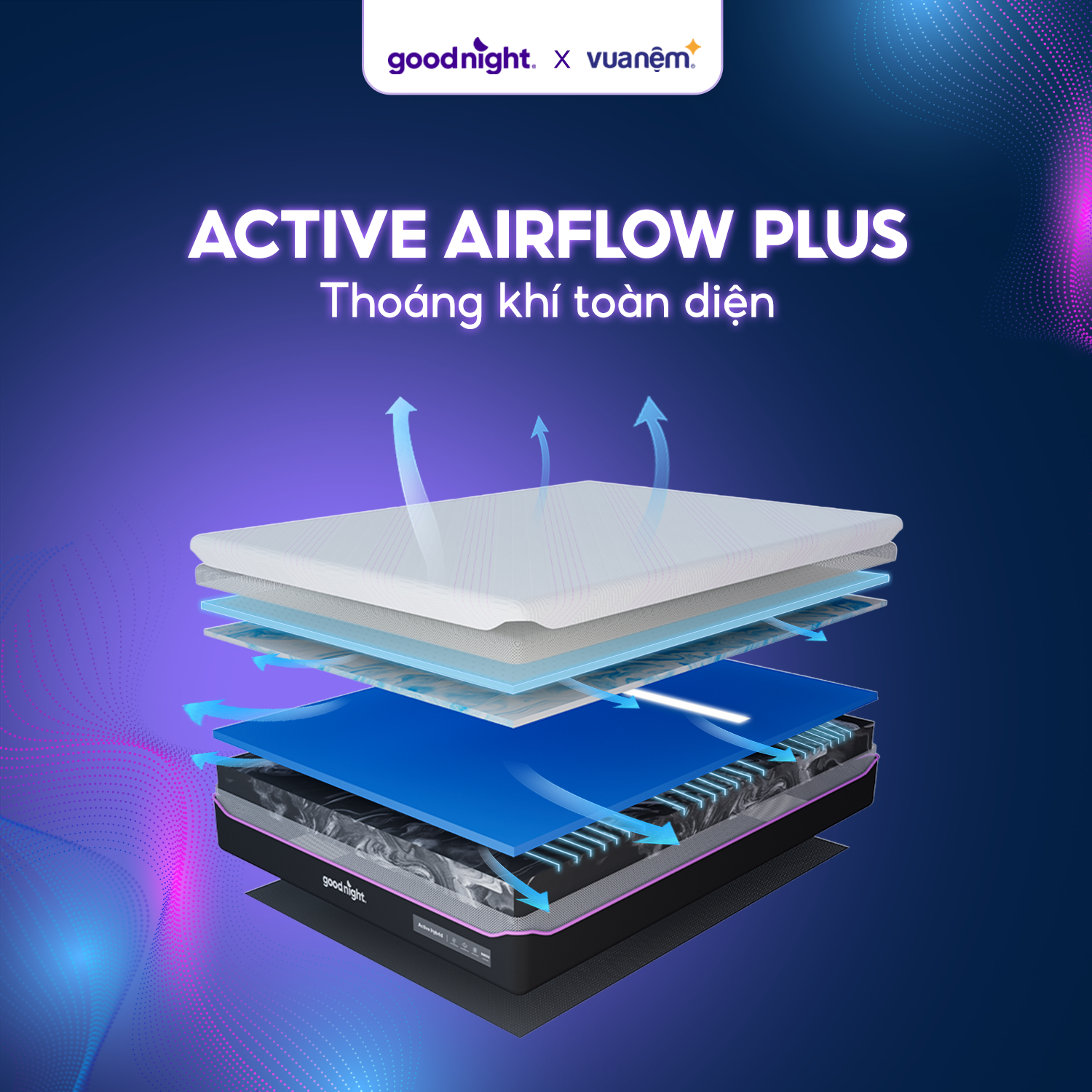 • Phù hợp cho người dễ đổ mồ hôi khi ngủ   Công nghệ Active Airflow Plus - Thoáng khí toàn diện Không chỉ điều hòa thân nhiệt hiệu quả, Goodnight Active Hybrid còn được thiết kế tối ưu lưu thông không khí, giúp loại bỏ ẩm và nhiệt tích tụ nhờ cấu trúc kênh lưu thông khí đa chiều: