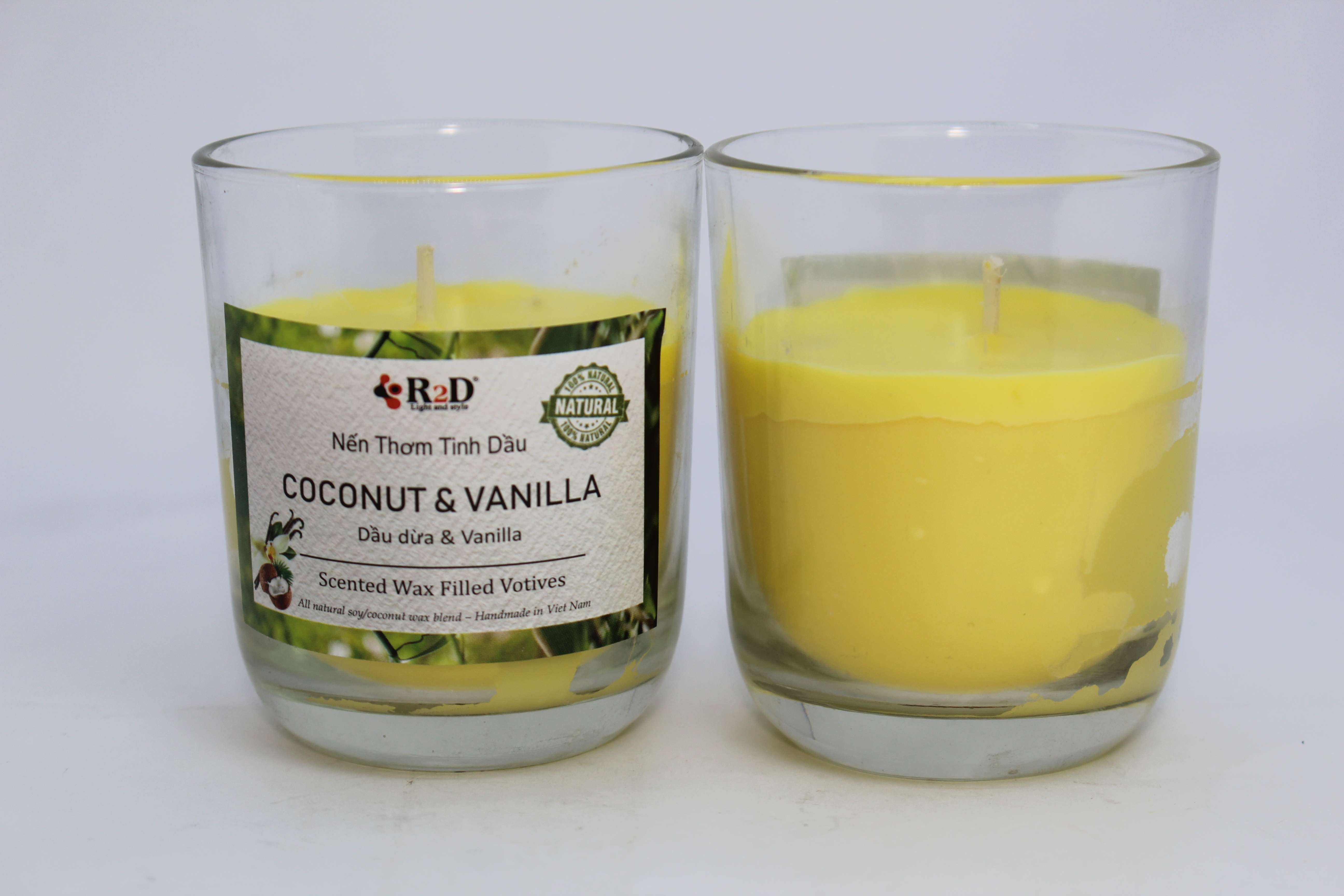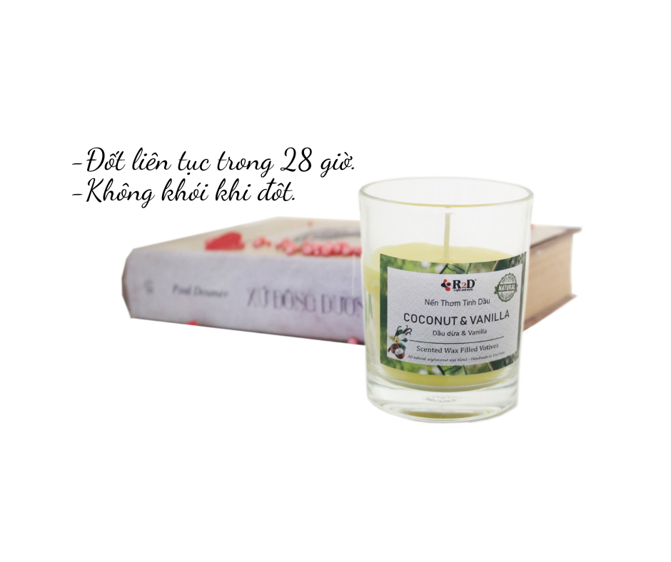 Nến Thơm, Tinh Dầu Coconut-Vanilla, Nến Thơm Phòng, [Ly 300g], Đến Từ Shop R2D, Làm Từ Thành Phần Tự Nhiên, Lành Tính. -Tất cả chúng ta đều cảm thấy thoải mái khi không gian xung quanh có một hương thơm tuyệt vời, chúng có thể giúp thay đổi tâm trạng và ngày cả ở cường độ mùi rất nhẹ cũng mang lại một môi trường dễ chịu và giúp ngủ ngon hơn. -Tuy nhiên, việc lựa chọn các sản phẩm mùi hương nào cũng được nhiều người quan tâm. Nến thơm là hình thức khuếch tán mùi hương được nhiều người yêu thích. -Tinh dầu vanilla giúp cân bằng mức độ hormone đồng thời làm giảm căng thẳng, giúp tinh thần thoải mái, bình ổn tâm trạng và giảm căng thẳng thần kinh. -Việc lựa chọn một loại nến thơm với mục tiêu thư giản, giảm căng thẳng thần kinh sau một ngày làm việc hay tạo ra không gian thoải mái thư giản trong văn phòng làm việc của công ty thì nến thơm COCONUT & VANILLA là một lựa chọn tuyệt vời cho bạn. Định lượng: 300g. Kích thước: Ly (8.5x7.0cm) Thời gian đốt: 28 giờ trong điều kiện phù hợp. -Sản phẩm được làm từ nguyên liệu tự nhiên như dầu dừa, dầu cọ, dầu đậu nành và 5% tinh dầu Vanilla tinh chất. Sản phẩm an toàn, thiên thiện với môi trường, không có khói khi đốt và có thể đốt liên tục 28h, hoặc bạn có thể sử dụng và tắt nến sau khi căn phòng đã ngần tràn mùi thơm Vanilla. Hướng dẫn sử dụng: