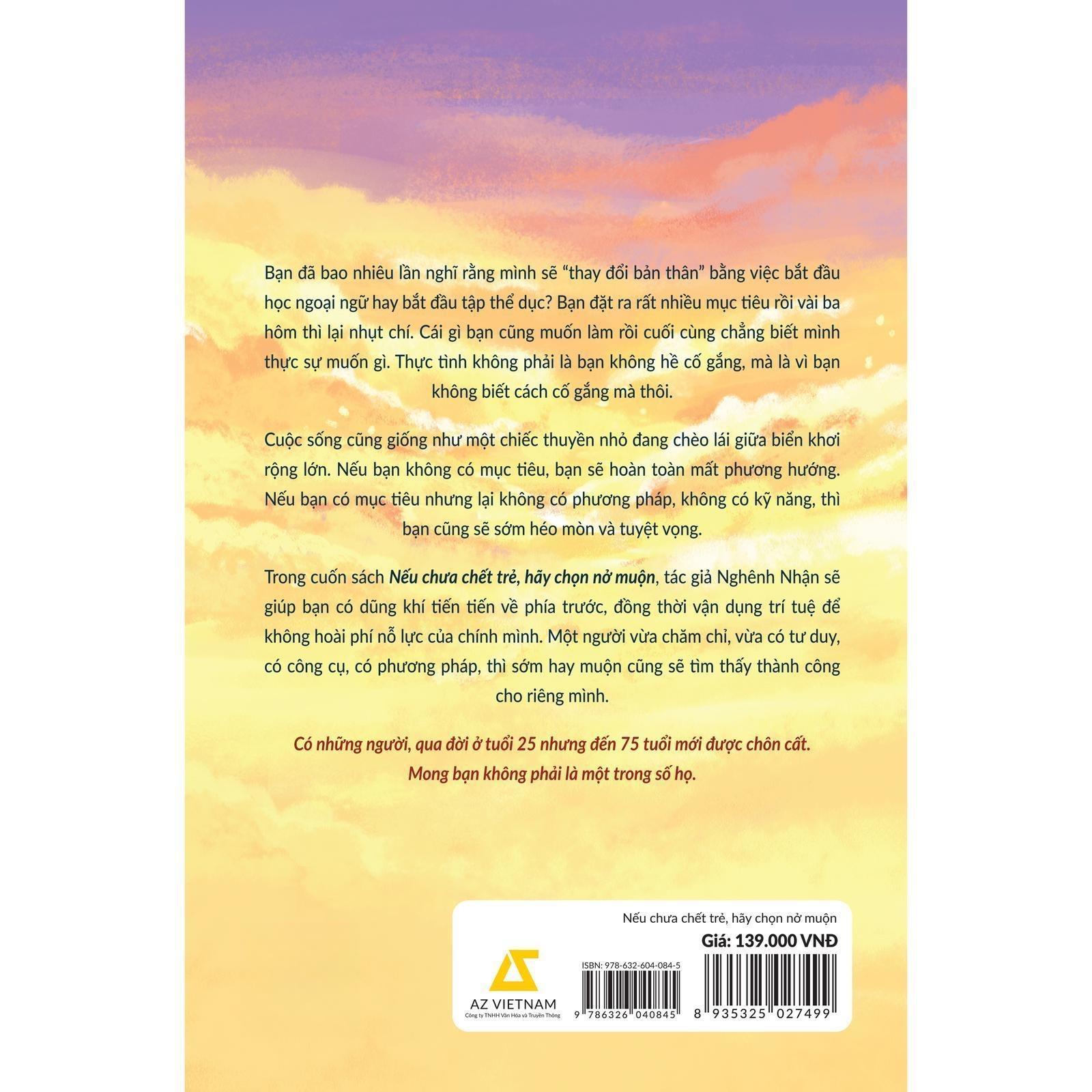 Giới thiệu sách: NẾU CHƯA CHẾT TRẺ, HÃY CHỌN NỞ MUỘN Bạn đã bao nhiêu lần nghĩ rằng mình sẽ ""thay đổi bản thân"" bằng việc bắt đầu học ngoại ngữ hay bắt đầu tập thể dục? Bạn đặt ra rất nhiều mục tiêu rồi vài ba hôm thì lại nhụt chí. Cái gì bạn cũng muốn làm rồi cuối cùng chẳng biết mình thực sự muốn gì. Thực tình không phải là bạn không hề cố gắng, mà là vì bạn không biết cách cố gắng mà thôi. Cuộc sống cũng giống như một chiếc thuyền nhỏ đang chèo lái giữa biển khơi rộng lớn. Nếu bạn không có mục tiêu, bạn sẽ hoàn toàn mất phương hướng. Nêu bạn có mục tiêu nhưng lại không có phương pháp, không có kỹ năng, thì bạn cũng sẽ sớm héo mòn và tuyệt vọng. Trong cuốn sách Nếu chưa chết trẻ, hãy chọn nở muộn, tác giả Nghênh Nhận sẽ giúp bạn có dũng khí tiến tiến về phía trước, đồng thời vận dụng trí tuệ để không hoài phí nỗ lực của chính mình. Một người vừa chăm chỉ, vừa có tư duy, có công cụ, có phương pháp, thì sớm hay muộn cũng sẽ tìm thấy thành công cho riêng mình. Có những người, qua đời ở tuổi 25 nhưng đến 75 tuổi mới được chôn cất. Mong bạn không phải là một trong số họ.