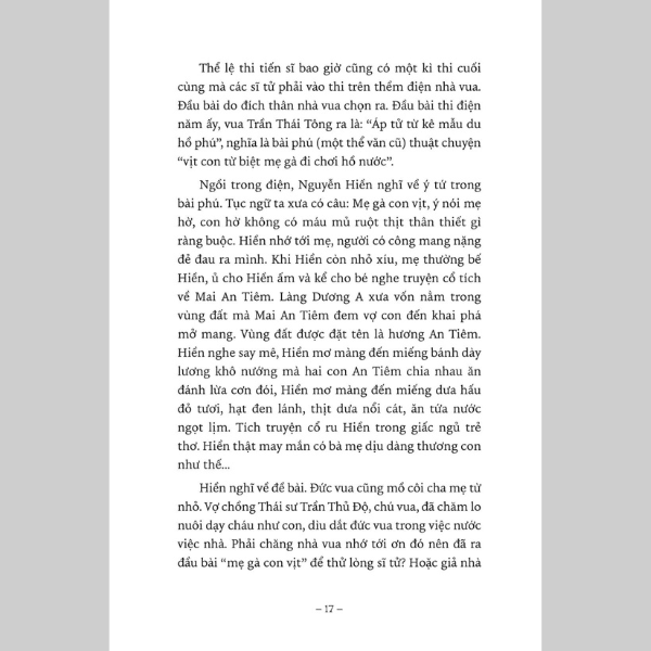 Ông Nguyễn Hiền đây rồi! Một tiếng dạ trong trẻo cất lên. Một cậu bé trạc mười ba tuổi, tóc còn để trái đào, mặc một bộ áo nâu thẫm màu vỏ già của người vùng biển. Tay cậu còn cầm một cuộn dây tơ nhỏ, thứ dây thường dùng để buộc lèo diều.”