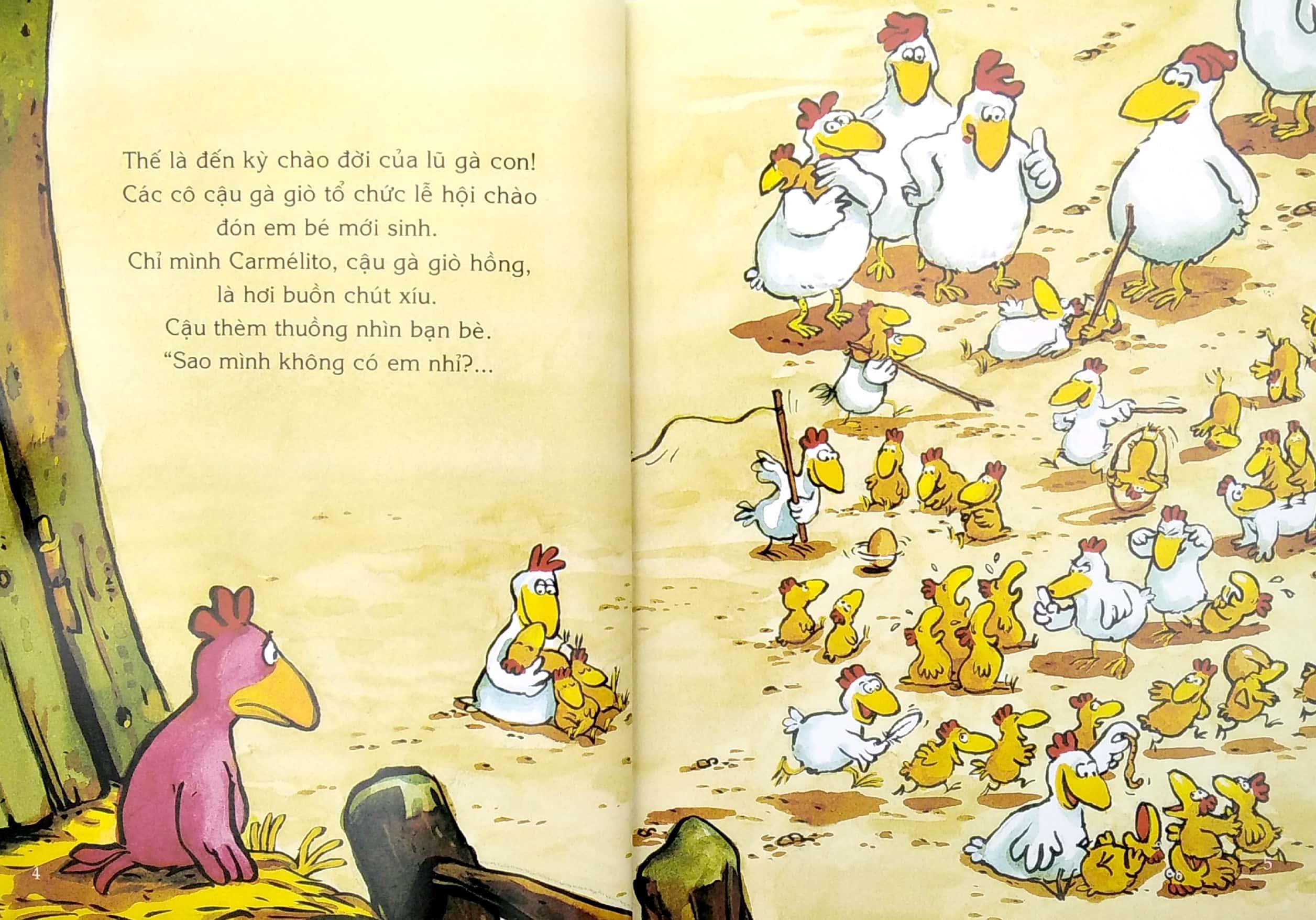 Thế là đến thời kỳ chào đời của lũ gà con. Các cô cậu gà giò tổ chức lễ hội chào đón em bé mới sinh. Chỉ mình Carmélito, cậu gà giò hồng là hơi buồn chút xíu. Cậu thèm thuồng nhìn bạn bè. “Sao mình không có em nhỉ…Nếu mình có em, bọn mình sẽ cùng nhau chơi Ga-Giò-Nhảy hoặc Kéo-Giòi…"
