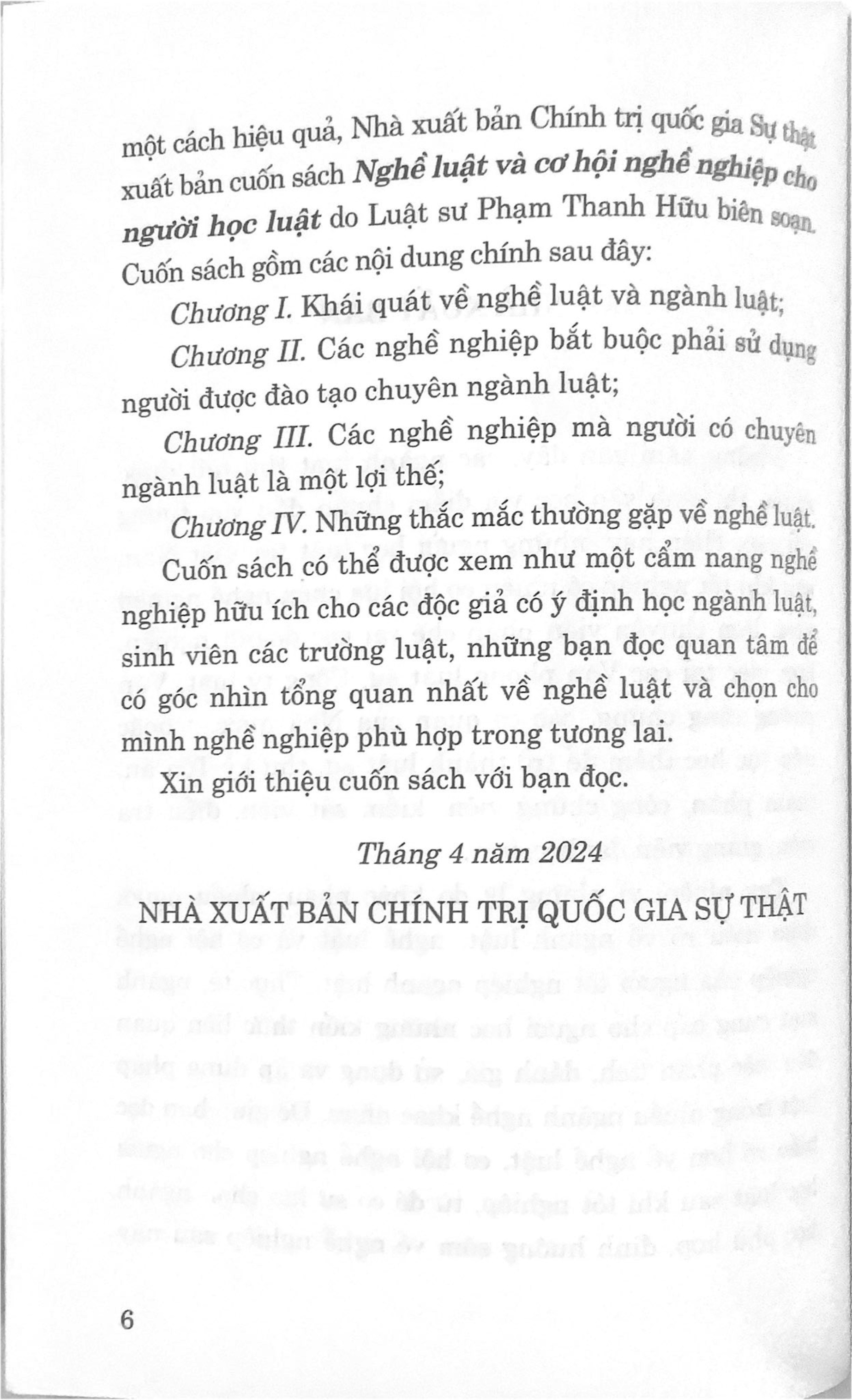 Nghề Luật và cơ hội nghề nghiệp cho người học luật Tác giả: Luật sư Phạm Thanh Hữu Nhà xuất bản: Chính Trị Quốc Gia Sự Thật Khổ sách: 14.5*20.5cm Năm phát hành: 5.2024 Công ty phát hành: Nhà xuất bản Chính Trị Quốc Gia Sự Thật Giá bìa: 54.000đ Số trang: 180 trang Hình thức bìa: Bìa mềm Cuốn sách gồm các nội dung chính sau đây: Chương I: khái quát về nghề luật và ngành luật. Chương II: các nghề nghiệp bắt buộc phải sử dụng người được đào tạo chuyên ngành luật. Chương III: các nghề nghiệp mà người có chuyên ngành luật là một lợi thế. Chương IV: những thắc mắc thường gặp về nghề luật.