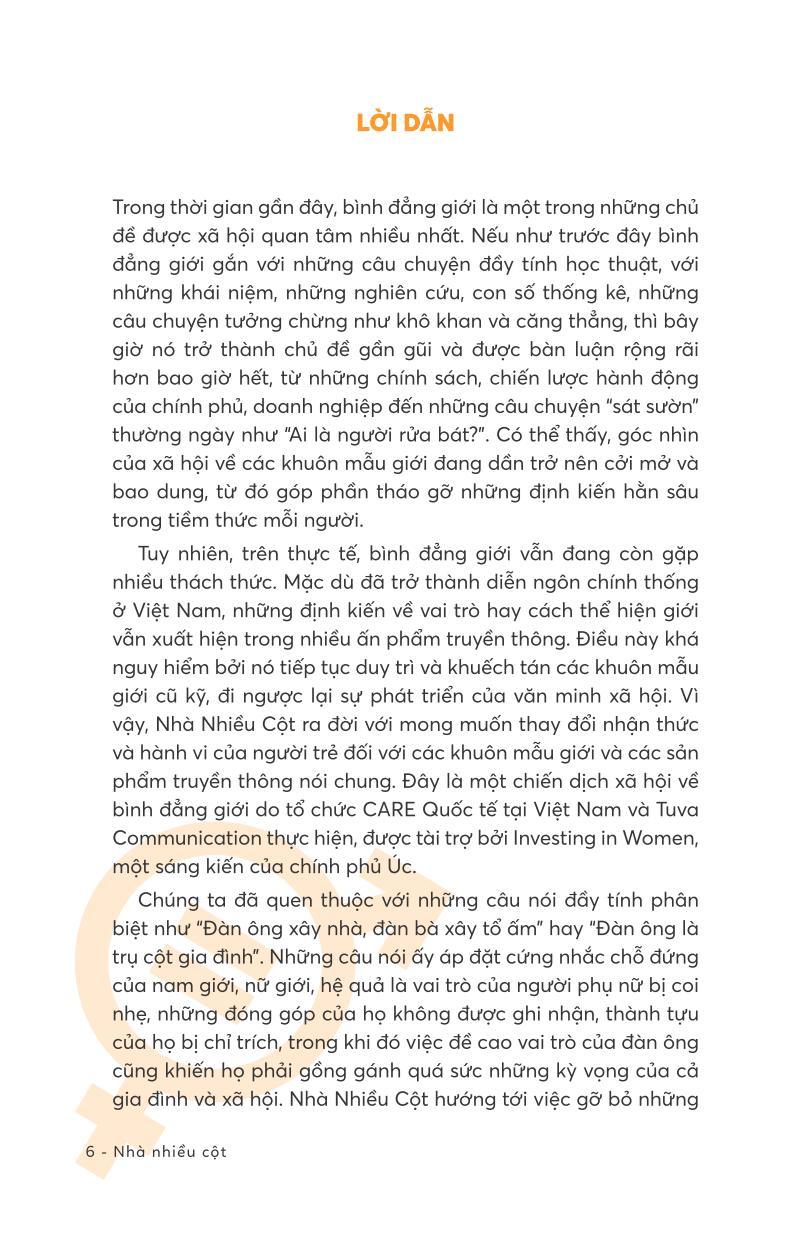 Chiến dịch #NhàNhiềuCột nhằm thay đổi nhận thức và hành vi của người trẻ đối với các định kiến giới và thay đổi các sản phẩm quảng cáo để hướng tới mục tiêu bình đẳng giới. Chiến dịch được thực hiện bởi Tổ chức CARE Quốc tế tại Việt Nam và TUVA Communication, với nguồn tài trợ của Investing in Women, một sáng kiến của Chính phủ Australia.