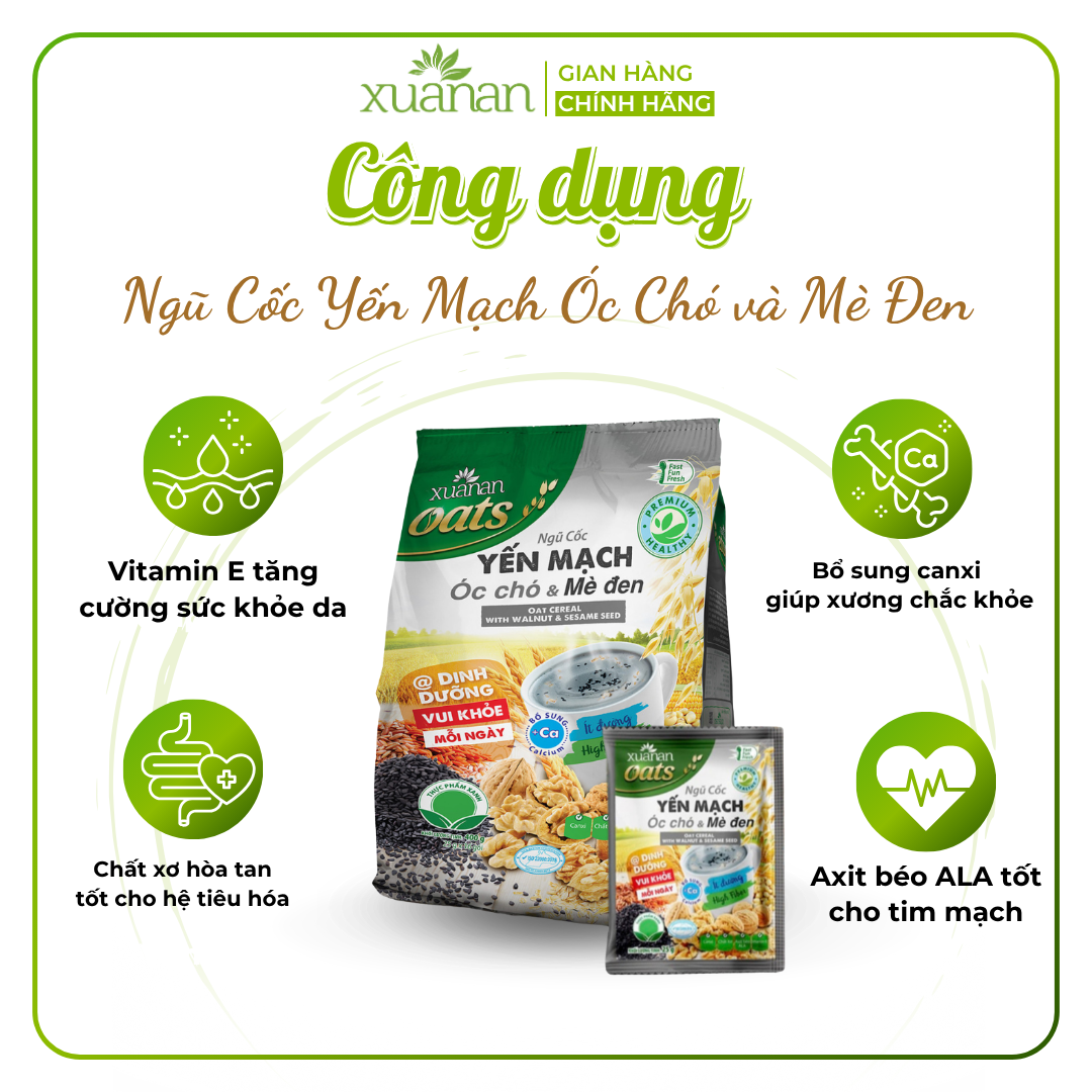 NGŨ CỐC YẾN MẠCH ÓC CHÓ VÀ MÈ ĐEN – TÚI 400G (25G*16 GÓI)  Yến Mạch, Óc chó và Mè đen là ba loại hạt được dùng khá phổ biến đối với mỗi gia đình vì chúng có tác dụng rất tốt cho sức khỏe. Đặc biệt, chúng phù hợp sử dụng với nhiều lứa tuổi, ngay cả trẻ nhỏ. Khi kết hợp 3 nguyên liệu này trong chế biến ngũ cốc thì chúng là loại ngũ cốc “Ngũ cốc Yến mạch, Óc chó và Mè đen” siêu hương vị thơm ngon, dinh dưỡng, ngậy béo nhưng không ngấy. Yến mạch chứa đa dạng các dưỡng chất, chất xơ hòa tan, beta-glucan giúp giảm các cholesterol “xấu” (LDL). Các chất này cũng được xem là có đặc tính làm dịu tự nhiên và dễ tiêu hóa. hoạt chất alkaloid gramine có trong Yến mạch là một chất làm dịu tự nhiên, giúp chữa trầm cảm, lo âu và mất ngủ mà không gây tác dụng phụ. Ngủ ngon giấc sẽ khiến bộ não của bạn được phục hồi và làm việc hiệu quả hơn. Ngoài ra, Yến mạch còn chứa nhiều chất xơ hòa tan hơn các loại ngũ cốc khác, nên Yến mạch được tiêu hóa chậm, kéo dài cảm giác no. Nhiều nghiên cứu cho thấy lựa chọn ăn những thực phẩm giúp no lâu có thể làm giảm lượng calo cơ thể tiêu thụ. Trong một bữa ăn bao gồm nhiều thực phẩm giúp no lâu, bạn sẽ giảm được khẩu phần ăn và cảm giác muốn ăn vặt giữa các bữa ăn. Điều này giúp hỗ trợ kiểm soát cân nặng bằng cách cắt giảm bớt lượng calo tổng thể mà bạn tiêu thụ mỗi ngày. Hạt óc chó giàu axít báo alpha-linolenic (ALA), một loại axít béo omega-3. ALA giúp giảm cholesterol (LDL) và giữ cho động mạch khỏe mạnh. Ngoài ra, hạt óc chó còn chứa axít ellagic và tocopherol (phức hợp vitamin E) bao gồm alpha, delta và gamma tocopherol giúp giảm nguy cơ mắc bệnh ung thư, bệnh tim và duy trì sức khỏe làn da, mô. Hạt óc chó cũng chứa serotonin, một hoạt chất giúp giảm căng thẳng. Mè đen là nguồn dồi dào vitamin E, giúp cải thiện tình trạng da, cũng như tăng cường sức khỏe tim mạch và hệ thần kinh. Mè đen cũng chứa các hormone thực vật (như sesamin và sesamolin) giúp giảm huyết áp và bảo vệ gan trước các tổn thương do độc tố gây ra. Hạt mè giàu canxi, cần thiết cho xương và răng. Theo y học cổ truyền, Mè đen có các tác dụng như: Giữ cho da đẹp và tóc lâu bạc, Chữa đầy chướng bụng, Chữa sản phụ thiếu sữa, Chữa viêm mũi mạn tính, Chữa chân tay đau buốt hơi thũng, Chữa táo bón. Đối tượng sử dụng: Trẻ từ 3 tuổi trở lên và người lớn. Đặc biệt là người ăn theo chế độ ăn giảm đường. Hướng dẫn sử dụng: Hòa 1 gói Ngũ cốc với khoảng 125ml nước sôi, khuấy đều trước khi dùng. Dùng 2-3 gói mỗi ngày Bảo quản: Bảo quản nơi khô ráo, thoáng mát; tránh tiếp xúc trực tiếp với không khí và ánh nắng mặt trời. Thông tin cảnh báo: Không dùng khi sản phẩm bị rách, mốc hoặc đã hết hạn sử dụng. Sản phẩm của: Công ty TNHH Thực Phẩm Dinh Dưỡng Xuân An