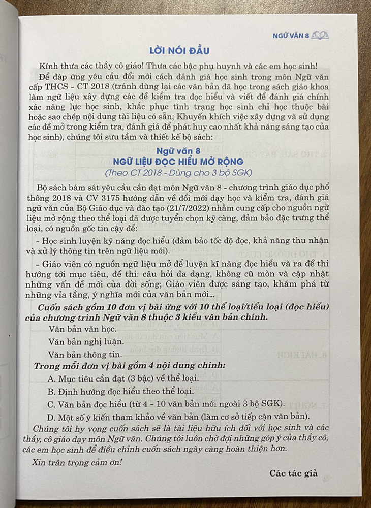 Cuốn sách gồm 10 đơn vị bài ứng với 10 thể loại/tiểu loại (đọc hiểu) của chương trình Ngữ văn 8 thuộc 3 kiểu văn bản chính.