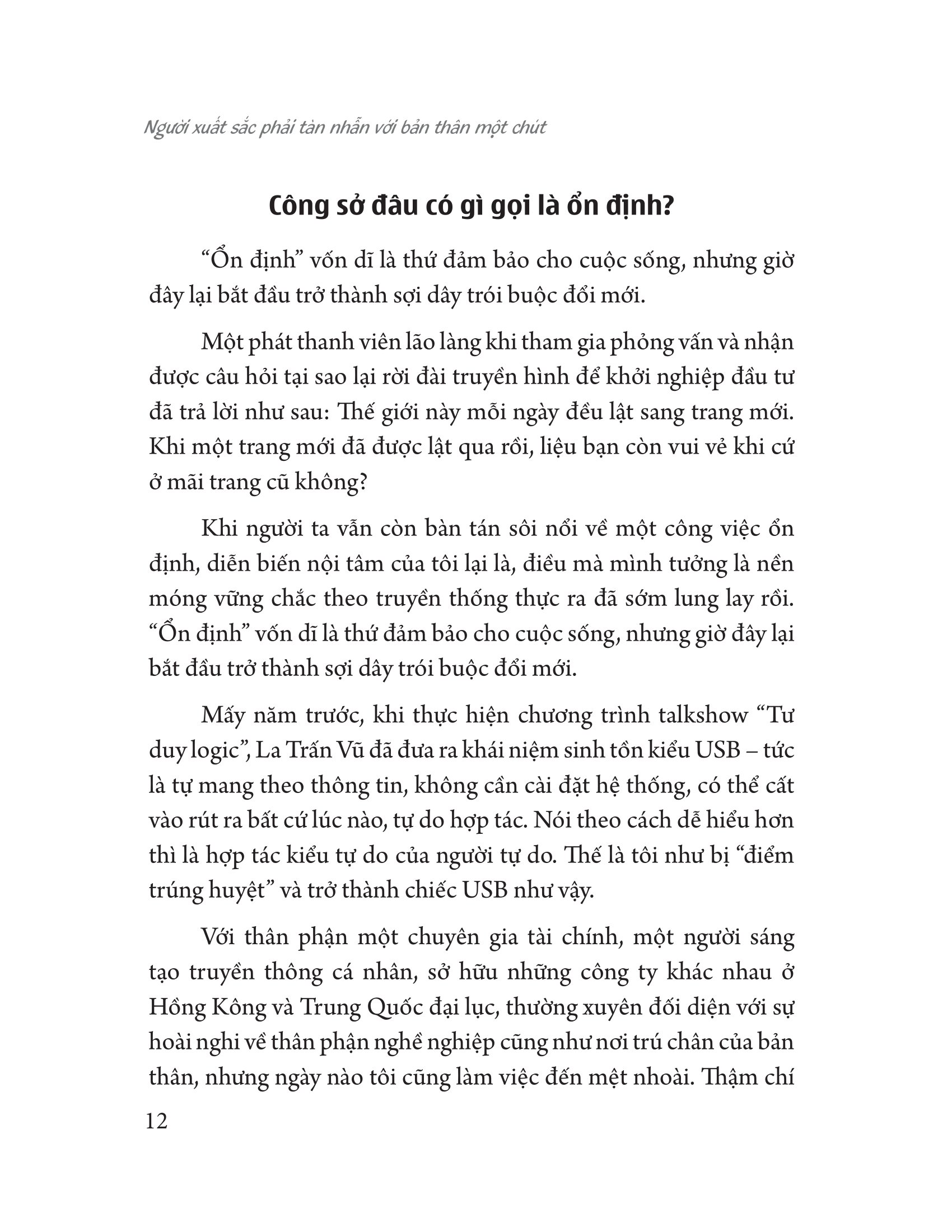 Hành trình của tác giả Trần Lập Phi là hành trình "chuyển đổi đường đua của cuộc đời". Khi đọc cuốn sách này, bạn sẽ phải tự đặt ra câu hỏi rằng liệu tương lai "ổn định", êm ả không chút bất ngờ có phải tương mà bản thân mong muốn hay không. Bạn sẽ phải làm việc với bản thân, giữa một bên truyền thống là theo đuổi sự yên ổn, thế giới ngoài kia hiểm ác và đầy những điều bất trắc; còn nửa còn lại thì thúc giục bạn trải nghiệm và khám phá nhiều hơn, đừng quá "ổn định" mà kìm hãm chính bản thân mình.