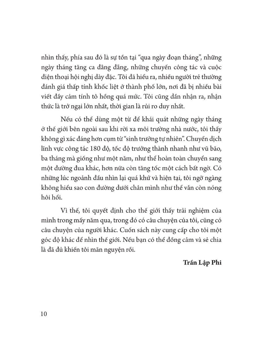 Người Xuất Sắc Phải Tàn Nhẫn Với Bản Thân Một Chút "So với tương lai đầy những điều không thể đoán trước, tương lai mà nhắm mắt cũng đoán ra được lại khiến tôi sợ hãi hơn." Một cuốn sách giúp bạn sử dụng thời gian tối ưu để làm điều mình muốn. Đây chắc chắn là một thời đại tốt đẹp, chúng ta có thể không cần thỏa hiệp, bắt đầu không chấp nhận việc dùng chi phí thời gian đắt đỏ để chứng minh một kết quả gượng ép. Nhưng đây dường như cũng là một thời đại tồi tệ, vì sức kiên nhẫn với thời gian dường như ngày càng yếu đi, chúng ta không thể nào ngồi yên để chờ thời gian mài giũa. Muốn "trùng tu" chính nội tâm của mình thì cần phải đánh đổi thứ quý giá nhất đối với bản thân, và đó không gì khác ngoài thời gian. Mọi trải nghiệm cảm động và vĩ đại đều ẩn chứa những tinh hoa của thời gian. . Một cuốn sách thôi thúc bạn bước ra khỏi vùng an toàn "ổn định" để trải nghiệm cuộc đời. Hành trình của tác giả Trần Lập Phi là hành trình "chuyển đổi đường đua của cuộc đời". Khi đọc cuốn sách này, bạn sẽ phải tự đặt ra câu hỏi rằng liệu tương lai "ổn định", êm ả không chút bất ngờ có phải tương mà bản thân mong muốn hay không. Bạn sẽ phải làm việc với bản thân, giữa một bên truyền thống là theo đuổi sự yên ổn, thế giới ngoài kia hiểm ác và đầy những điều bất trắc; còn nửa còn lại thì thúc giục bạn trải nghiệm và khám phá nhiều hơn, đừng quá "ổn định" mà kìm hãm chính bản thân mình. Bởi cái bạn coi là "ổn định" cũng chưa chắc là ổn định. "Tôi coi bản thân như một người ngắm nhìn thế giới. Nhiều lúc, vì chưa từng nhìn thấy thế giới bên ngoài, chúng ta mới tưởng rằng phạm vi thế giới mà mình nhìn thấy được chỉ có vậy." Một cuốn sách nhắn nhủ tới bạn, hãy tận dụng triệt để thời gian để khám phá những điều mới. Cuốn sách sẽ cung cấp cho độc giả một góc độ khác để nhìn thế giới. Đời người ngắn ngủi, đừng vì sợ hãi mà bó hẹp cuộc sống bạn chỉ bằng hai từ "ổn định". Hãy đi đến nhiều nơi, gặp gỡ nhiều người, tiếp xúc với nhiều lĩnh vực, học hỏi nhiều kiến thức mới mẻ và ngày ngày tích lũy những điều bổ ích. Để khi nhìn lại, bạn sẽ tự hào khi thấy bản thân mình phát triển và trở nên tốt hơn mỗi ngày.