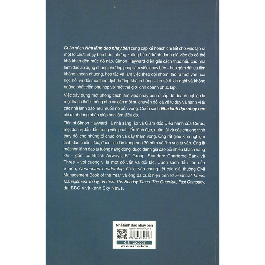 ️Về tác giả, Tiến sĩ Simon Hayward là nhà sáng lập và Giám đốc điều hành của Cirrus, một đơn vị dẫn đầu trong việc phát triển lãnh đạo, nhân tài và các chương trình thay đổi cho những tổ chức lớn và đầy tham vọng. Ông rất giàu kinh nghiệm lãnh đạo chiến lược, được tích lũy trong hơn 30 năm về lĩnh vực tư vấn. Ông là một nhà lãnh đạo tư tưởng năng động, được đánh giá cao bởi nhiều khách hàng lớn."