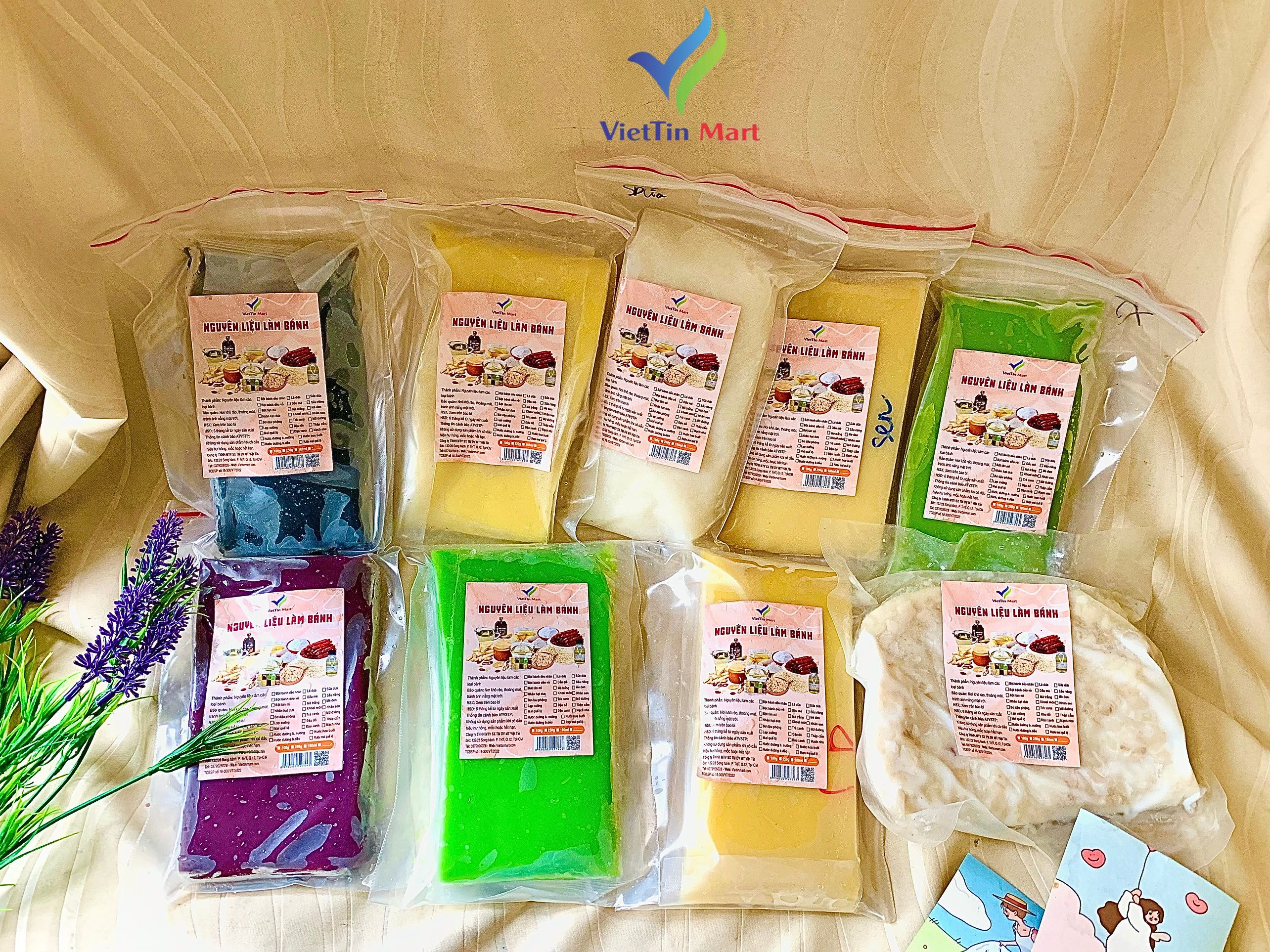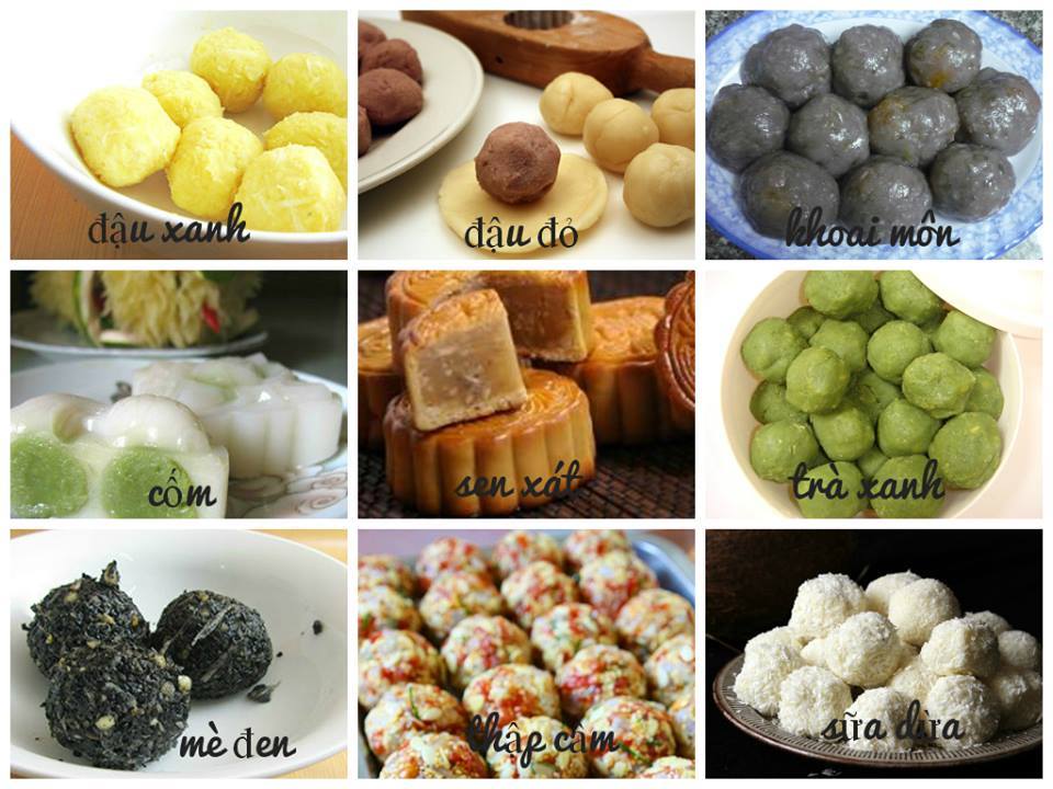Thành Phần: bột mì, đường, dầu ăn, muối, nước, các loại đậu (đậu xanh, đậu đỏ, hạt sen), lá dứa, mè đen, bột sầu riêng, khoai môn