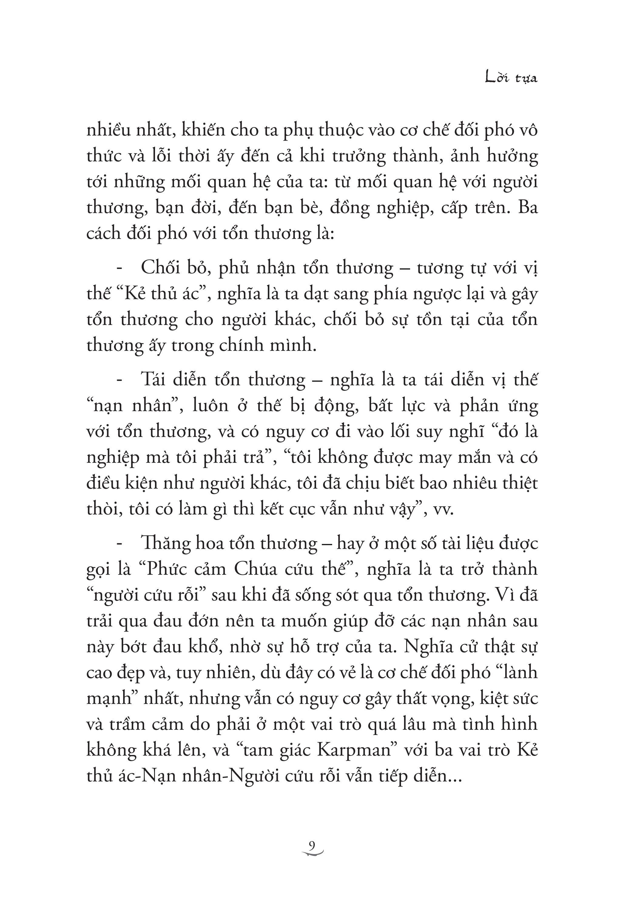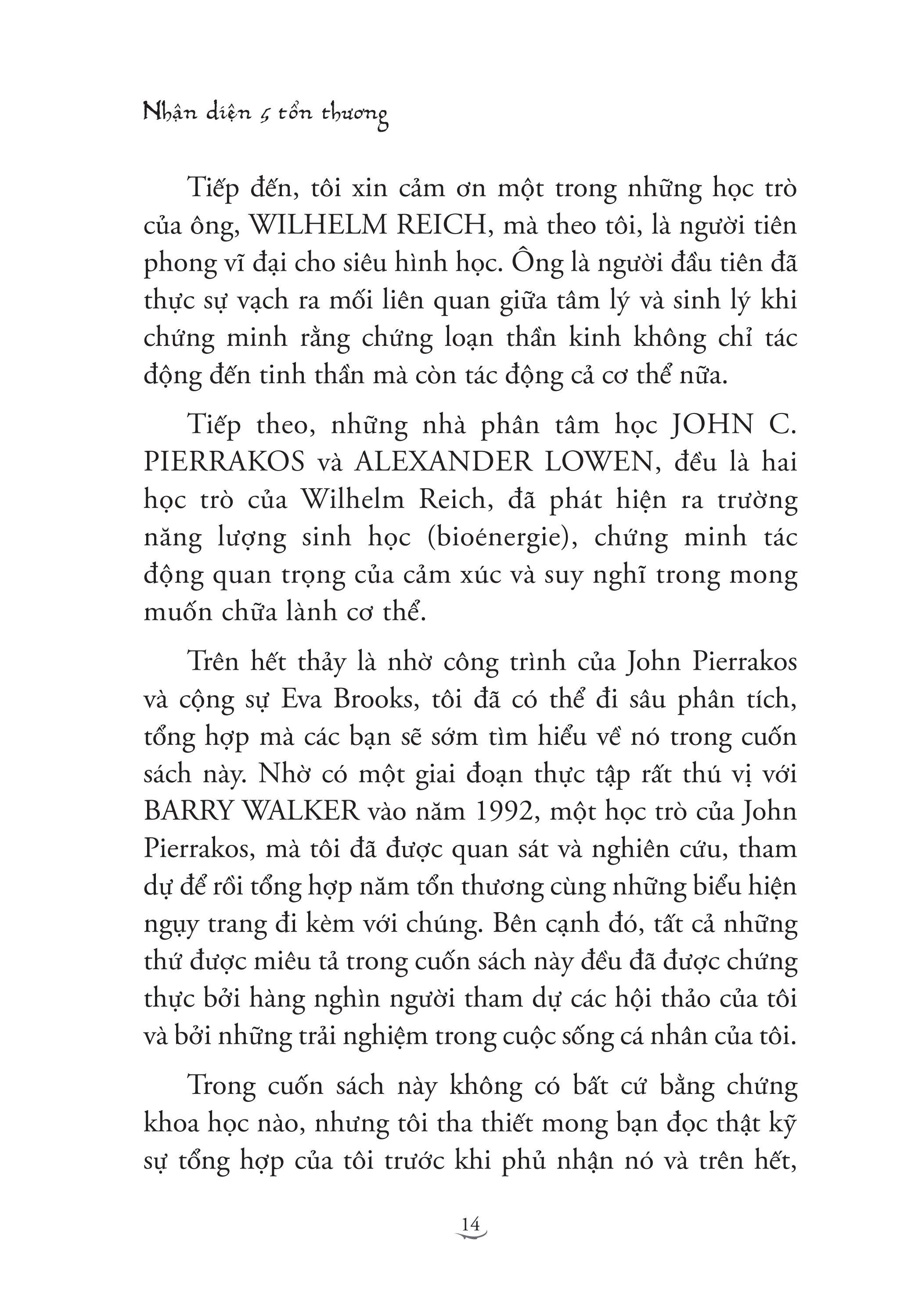 Cuốn sách mô tả những quan sát của tác giả trong hình thể, ngôn ngữ và lời nói của những người đang tái diễn tổn thương (với tổn thương nhục nhã, bị bỏ rơi, bị phủ nhận, bị phản bội, bị đối xử bất công). Nhờ những miêu tả trực giác này của tác giả mà chúng ta có thể phán đoán được một người đang bị ảnh hưởng nhiều bởi chấn thương cảm xúc nào, và việc tự đánh đồng chấn thương cảm xúc đầu đời ấy đã tác động lên cuộc đời họ, cách họ sinh hoạt, nói năng, cách họ đưa ra các lựa chọn của đời m.ình, và rồi được biểu hiện qua cơ thể ra sao. Qua những tổn thương đó, chúng ta thấy được mối quan hệ giữa mặt nạ vô thức ta mang trong quá trình đối phó với những tổn thương và biểu hiện của chúng trên cơ thể ta. Thông qua cuốn sách, chúng ta dần thấu hiểu tâm thức của con người và có thể rút ra được bài học cho chính m.ình trên hành trình “thành nhân” (theo cách nói của Carl Rogers) hay “thành toàn tự ngã” (theo cách nói của Carl Jung) của mỗi chúng ta.