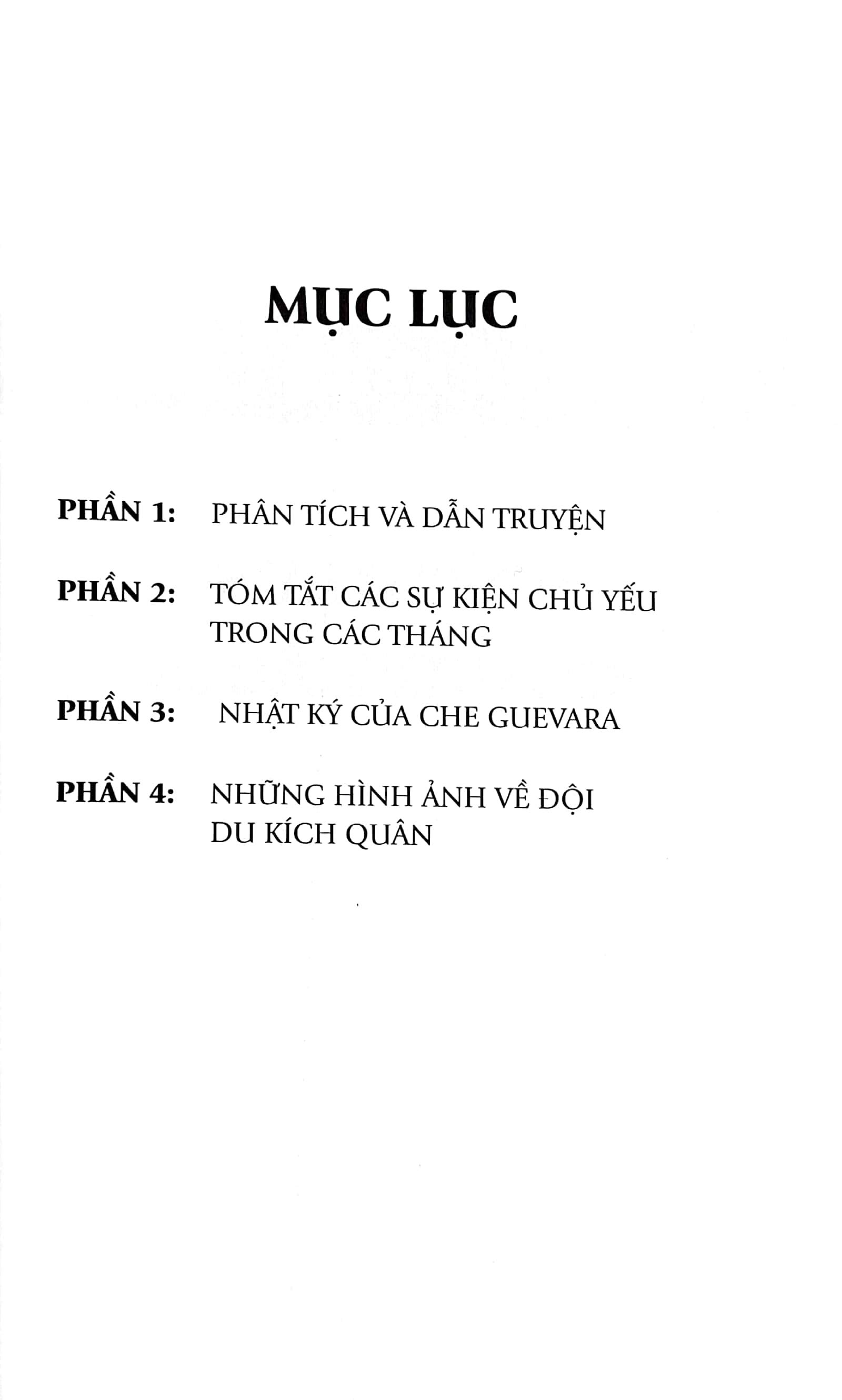 Sách gồm 4 phần nội dung: Phần 1 là phân tích các sự kiện liên quan đến Che Guevara trước và trong thời kỳ ông hoạt động ở Bolivia. Những phân tích này dựa trên nhiều tài liệu, trong đó bao gồm cả những cuốn nhật ký của các thành viên trong đoàn Du kích quân tại Bolivia do Che Guevara lãnh đạo, gồm: nhật ký của Che, và 3 cuốn nhật ký của đồng đội Che: Rolando, Pombo và Braulio. Phần 2 tóm tắt các sự kiện liên quan diễn ra trong các tháng đó. Phần 3 là Nhật ký của Che. Phần 4 là một số hình ảnh về các nhân vật trong nhóm Du kích quân.