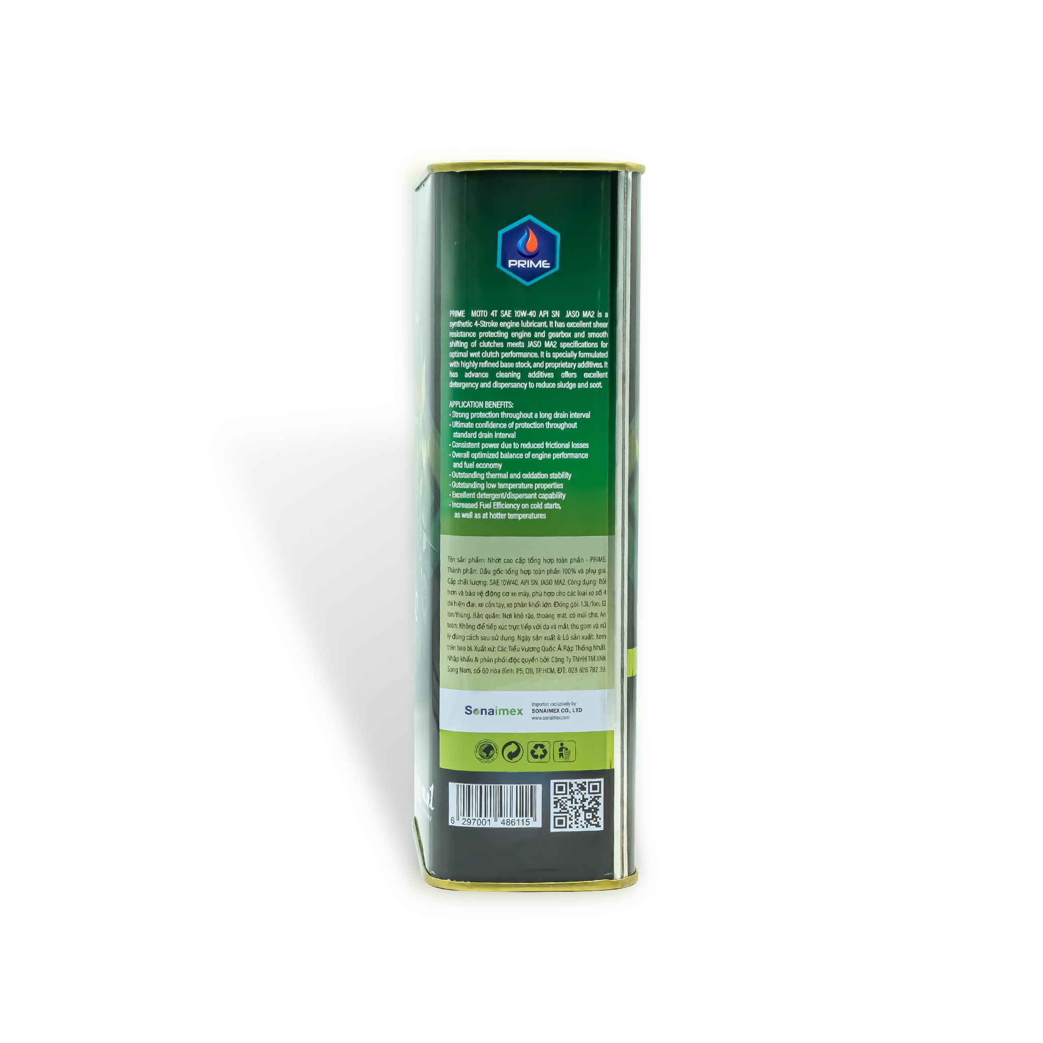 Nhớt Prime tổng hợp toàn phần có đa dạng dung tích 800ml, 1 lít, 1.1 lít, 1.3 lít được sản xuất từ dầu gốc nhóm IV (nhóm cao nhất) và các phụ gia cao cấp; có cấp độ nhớt SAE 10W40 và đạt cấp chất lượng API SN của Viện Dầu Mỏ Hoa Kỳ, đạt JASO MA2 dành cho xe phân khối lớn của Hiệp Hội Kỹ Sư Tự Động Hóa Nhật Bản; đáp ứng hoàn hảo các tiêu chuẩn chất lượng quốc tế dành cho dầu nhờn động cơ xe máy, motor PKL.