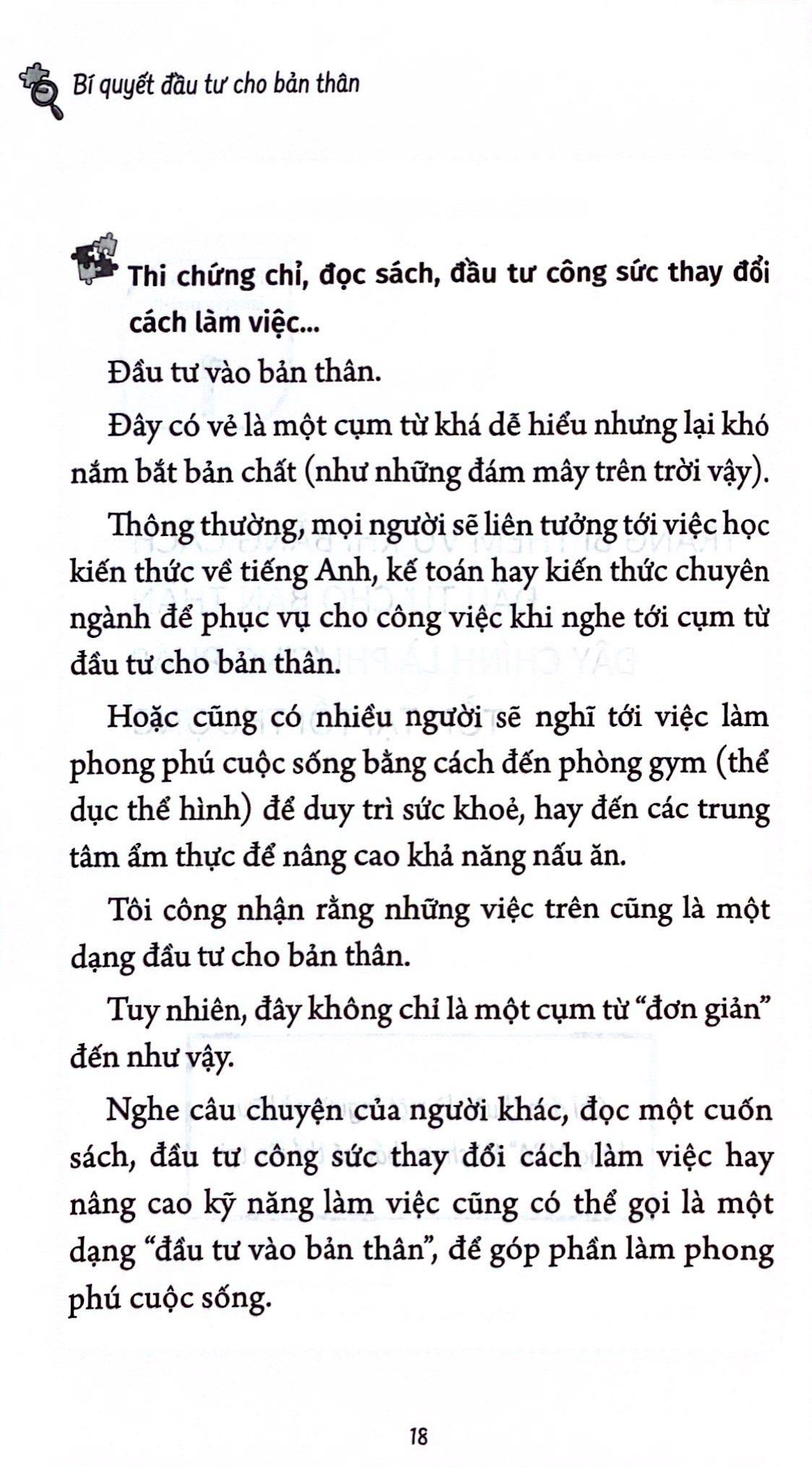 Ngoài ra trong cuộc sống cũng như trong công việc, không bao giờ tồn tại một công thức thành công nào dành cho tất cả mọi người. Vì vậy, việc đầu tư vào bản thân phải do tự m.ình suy nghĩ, và cần phải chọn một phương pháp cũng như đối tượng đầu tư mang "màu sắc cá nhân".