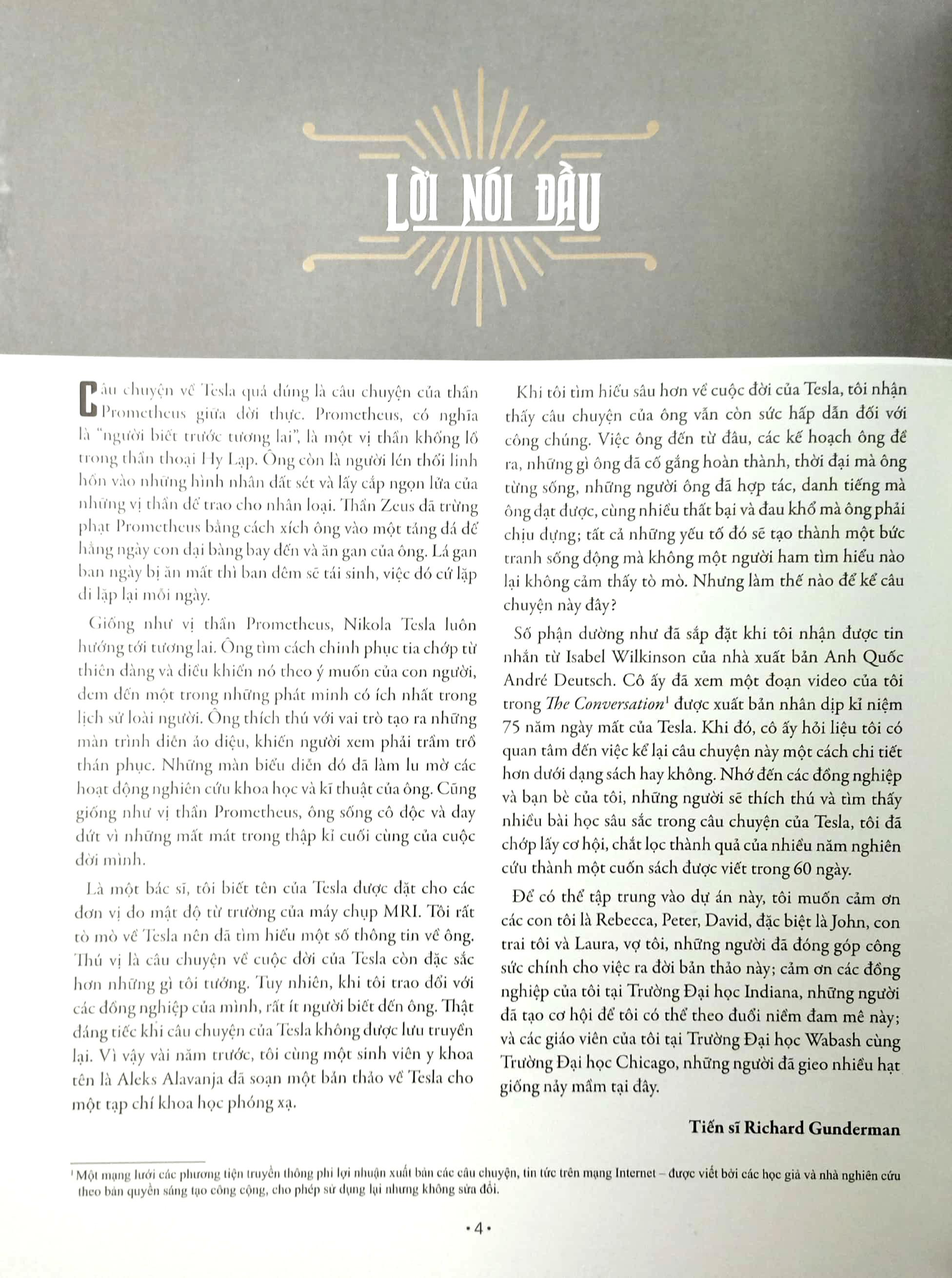 Được ca tụng là cha đẻ của dòng điện xoay chiều, Nikola Tesla đã làm thay đổi thế giới với các phát minh của mình. Nhà khoa học này đã cống hiến toàn bộ cuộc đời mình cho việc nghiên cứu, khám phá, phát minh với hơn 700 bằng sáng chế thuộc về ông. Ngay từ thuở ấu thơ, tâm trí của Tesla đã tràn ngập những suy nghĩ thách thức khoa học, khi trưởng thành, ông phân tích những giải pháp, phát minh ở mức độ vô cùng chi tiết để lý giải chúng, đồng thời tự phát triển những nguyên lý, lý thuyết mới định hình lại tương lai của khoa học.