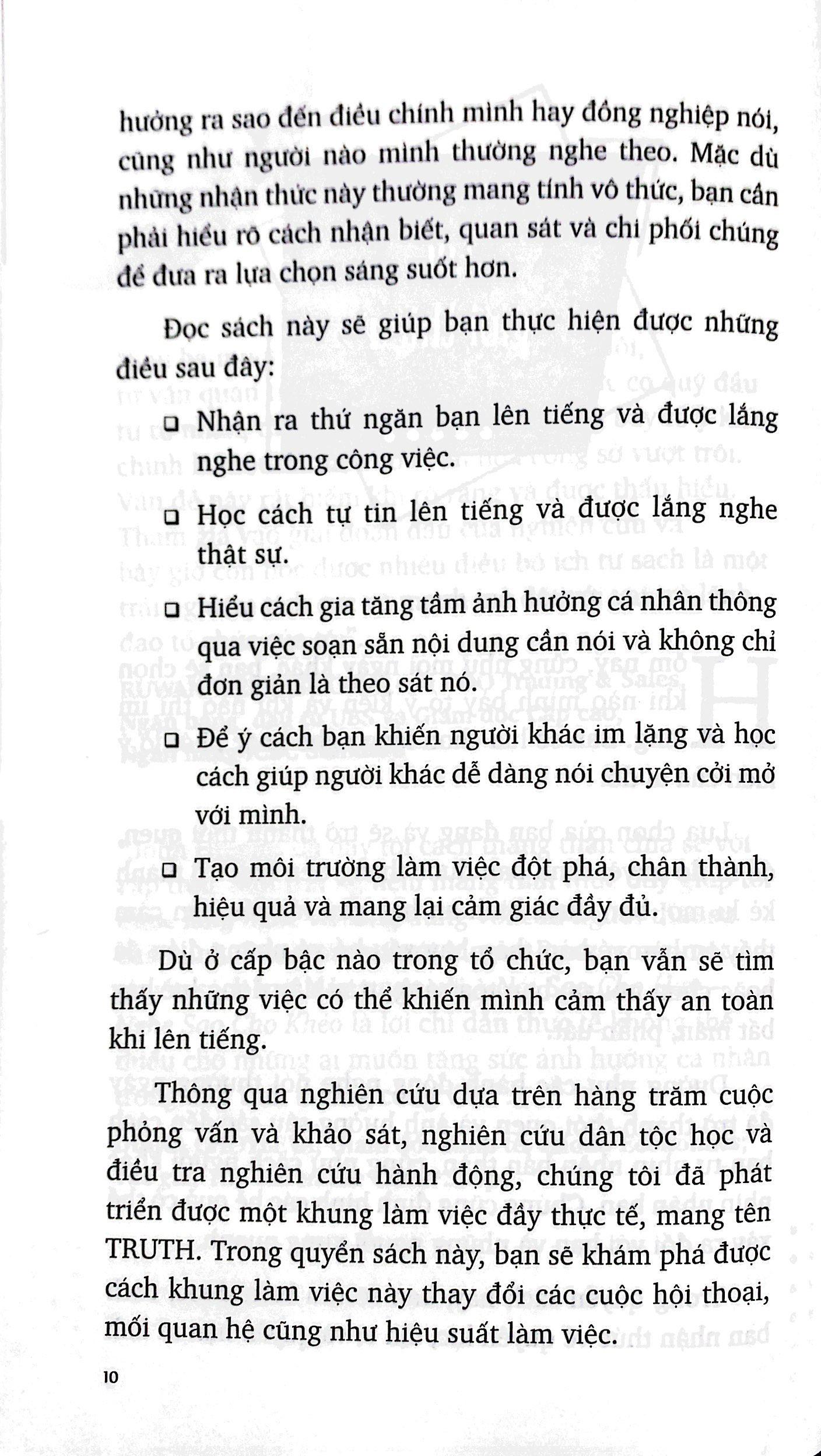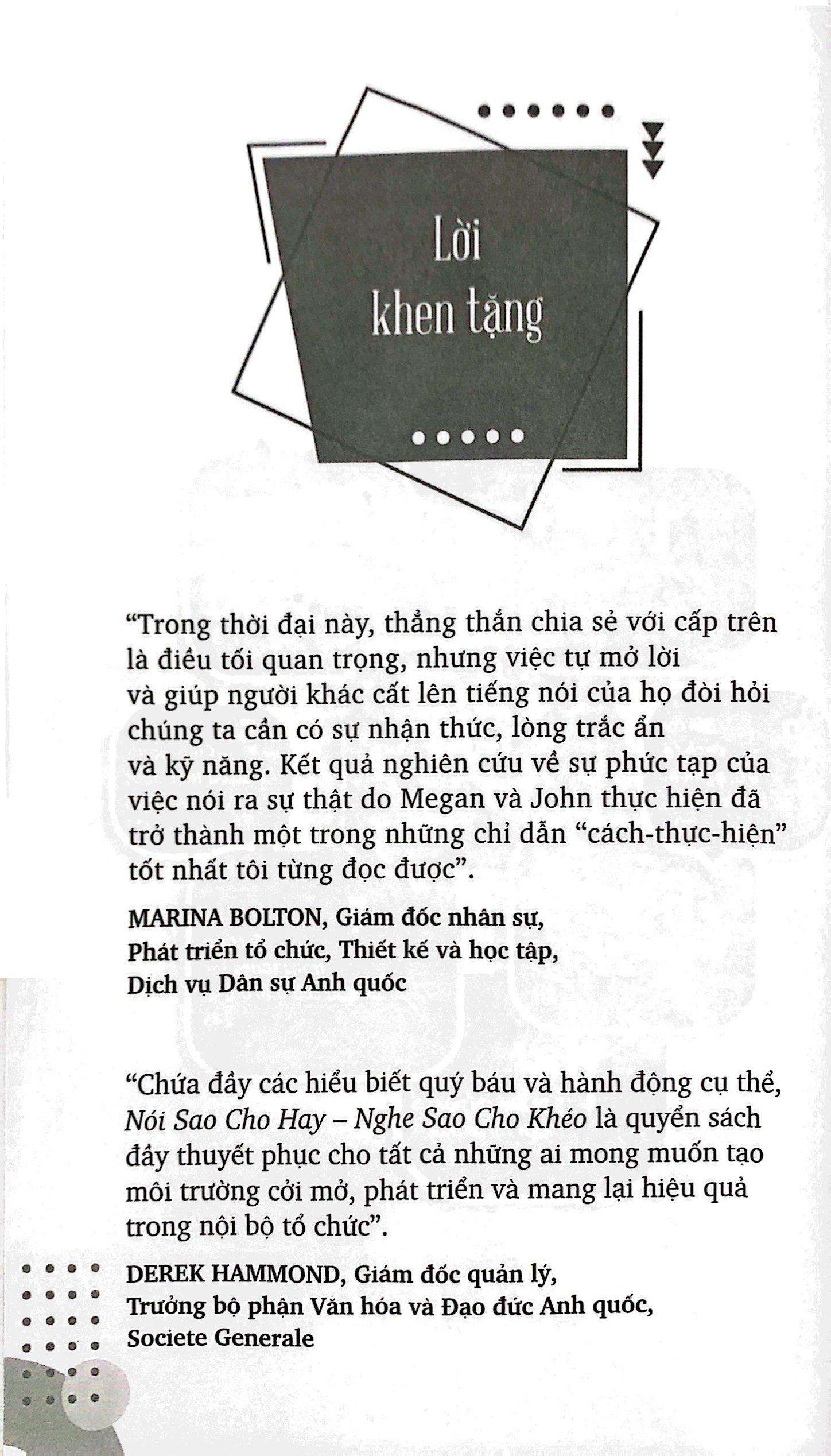 Nói Những Gì Cần Nói Và Nghe Những Gì Cần Nghe - Nói Sao Cho Hay Nghe Sao Cho Khéo Những cuộc đối thoại hàng ngày định nghĩa cách bạn nhìn nhận bản thân và hình ảnh của bạn trong mắt người khác. Những gì bạn nói hoặc không nói ra khi đối thoại có thể dẫn đến những hệ quả ảnh hưởng sâu sắc đến cuộc đời của bạn và những người xung quanh NÓI SAO CHO HAY NGHE SAO CHO KHÉO sẽ giúp bạn điều chỉnh sự khác biệt về quyền lực, để bạn có thể lên tiếng với sự tự tin và được lắng nghe. Nhưng nếu nói ra mà không ai nghe thì cũng không có nghĩa lý gì, nên sách cũng sẽ giúp bạn hiểu được quyền lực của bạn có thể khích lệ người khác lên tiếng cũng như khiến họ im lặng ra sao.