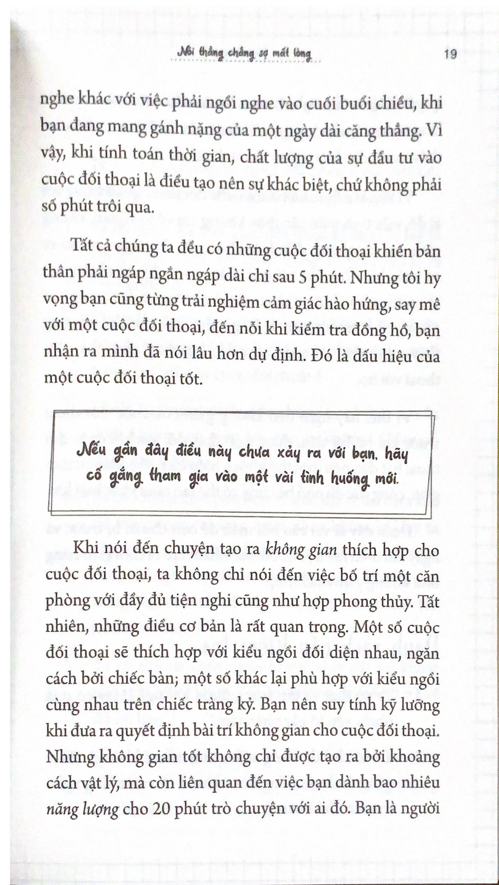 - Giới thiệu Nói Thẳng Chẳng Sợ Mất Lòng “Một trong những cuốn sách xuất sắc nhất mà tôi từng đọc.” – Andrew Forsyth, độc giả Amazon “Sách tập trung vào việc phát triển những kỹ năng thực tế và cụ thể, đồng thời đưa ra những công cụ dễ dàng ứng dụng và đưa vào thực tiễn.” – Francesca, độc giả Amazon Cuộc sống và công việc sẽ đơn giản hơn nếu bạn hiểu và nắm rõ những gì diễn ra bên trong một cuộc đối thoại hiệu quả. Từ đó, bạn có thể làm chủ tâm trí để có được sự tự tin cần thiết nhằm xử lý nỗi sợ hãi và giải quyết được mọi vấn đề. NÓI THẲNG CHẲNG SỢ MẤT LÒNG là chìa khóa vàng giúp bạn sở hữu 10 kỹ năng đối thoại hiệu quả, tinh tế và khéo léo. Bạn nên luyện tập các kỹ năng này thường xuyên để biến cuộc đối thoại nhàm chán, tầm thường trở nên thú vị, chất lượng. Đồng thời, sách còn phác thảo một số tình huống phổ biến, đặc biệt trong môi trường làm việc, và gợi ý cho bạn cách áp dụng 10 kỹ năng này vào thực tế sao cho thích hợp, hữu dụng