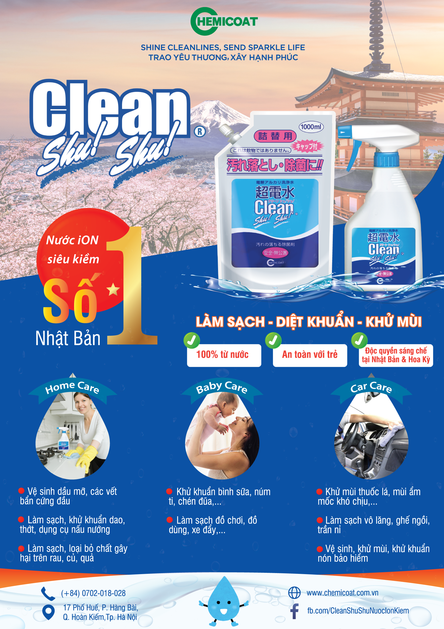Clean Shu! Shu! Làm sạch - Diệt khuẩn -Khử mùi Gói sản phẩm siêu tiết kiệm & giảm thiểu rác thải, bảo vệ môi trường. Túi được thiết kế có kèm nắp, có thể sử dụng nhiều lần bằng cách đóng nắp sau khi sử dụng. Rót từ túi sang các bình chuyên dụng (do nhà sản xuất đề xuất) để sử dụng. THÔNG TIN SẢN PHẨM Thành phần 100% nước ion kiềm, KHÔNG BỌT - KHÔNG MÙI - KHÔNG MÀU - KHÔNG HÓA CHẤT Nước ion kiềm Clean Shu Shu được điện phân hoàn toàn từ nước tinh khiết đã qua xử lý RO. Sản xuất trên dây truyền công nghệ của Nhật Bản, được cấp quyền sáng chế tại Mỹ và Nhật Bản. Đây là dòng sản phẩm LÀM SẠCH-DIỆT KHUẨN- KHỬ MÙI đứng số 1 tại Nhật Bản từ năm 1997. CÔNG DỤNG SẢN PHẨM