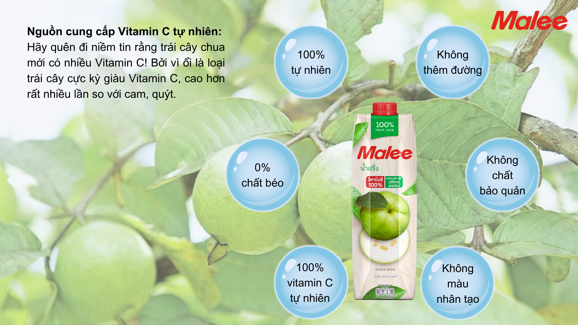Không chỉ là thức uống thơm ngon, mà giá trị dinh dưỡng có trong nước ép ổi còn được khoa học chứng minh là có công dụng thần kỳ đối với sức khoẻ con người. Nước Ép Ổi Malee là lựa chọn lý tưởng để bổ sung Vitamin C cho cơ thể. Với đóng gói hộp giấy Tetra Pak 1L, sản phẩm đảm bảo tiêu chuẩn vệ sinh an toàn thực phẩm theo quy định, đồng thời dễ dàng mang theo bên mình để chia sẻ cùng bạn bè hay làm quà tặng ý nghĩa cho người thân.