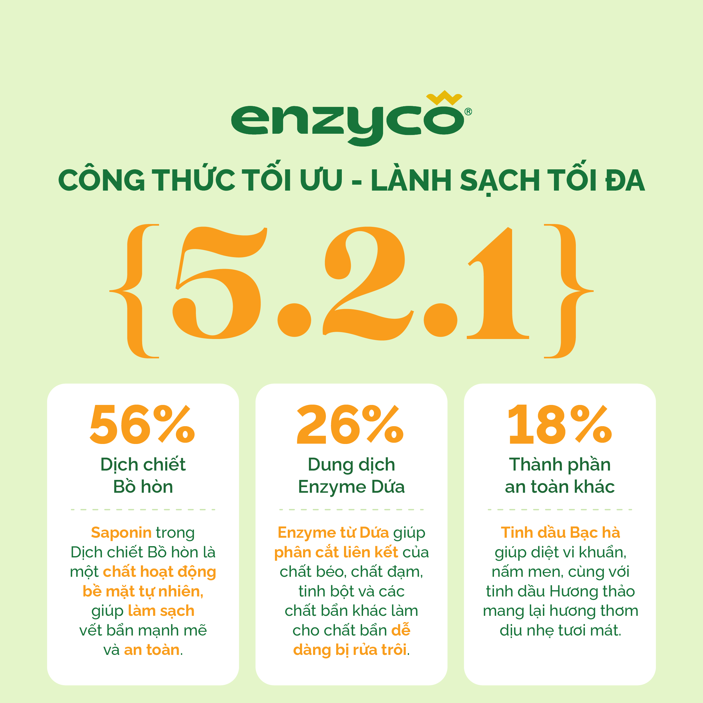 Nước giặt sinh học Enzyco là dòng nước giặt sinh học cao cấp chiết xuất từ Bồ hòn và Enzyme từ vỏ dứa, có khả năng diệt khuẩn tự nhiên cùng hương thơm tự nhiên từ tinh dầu bạc hà. Làm sạch mạnh mẽ mà vẫn lành tính.  Không chỉ dừng lại ở lo lắng, chúng tôi đã hành động.  Từ 2020 tới nay, chúng tôi, đội ngũ kỹ sư, chuyên gia công nghệ sinh học đã cùng nhau nghiên cứu và tìm giải pháp làm sao để tạo ra sản phẩm không chỉ LÀM SẠCH mà còn phải AN LÀNH thực sự.  “An lành cho người dùng, cho người nông dân khi trồng trọt thu hái, cho người công nhân khi sản xuất và cho cả đất mẹ thân yêu.” Chúng tôi nghiên cứu, cải tiến liên tục và tới nay đã tìm ra công thức tối ưu dựa trên hai nguyên liệu chính từ thiên nhiên mà từ lâu đã được công nhận rộng rãi về khả năng làm sạch diệu kỳ: Saponin trong quả bồ hòn và Enzyme từ dứa!