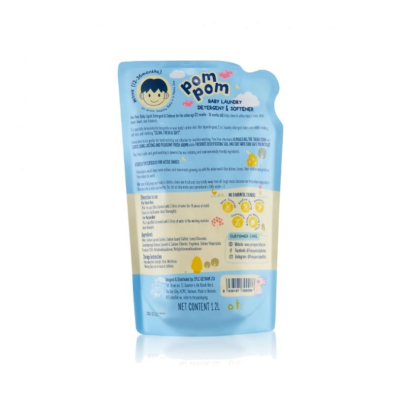 Nước giặt quần áo Pom Pom active được biết đến là dòng nước giặt đầu tiên phân theo độ tuổi. Với những em bé đã biết đi, những vết bẩn không chỉ là vết sữa, đồ ăn dặm, vệ sinh. Mà chúng còn đến từ vết đất, vết bẩn cứng đầu do bé nghịch ngợm. Thấu hiểu được nỗi lòng đó của ba mẹ, Pom Pom mang tới nước giặt riêng cho các bé ở độ tuổi trên. Trong nước giặt Pom pom có chứa chất Polyacrylate, giúp ngăn chất bẩn đọng lại trên vải sau khi giặt. Do đó, ba mẹ hoàn toàn yên tâm. Với ưu điểm vượt trội của dòng nước giặt như: