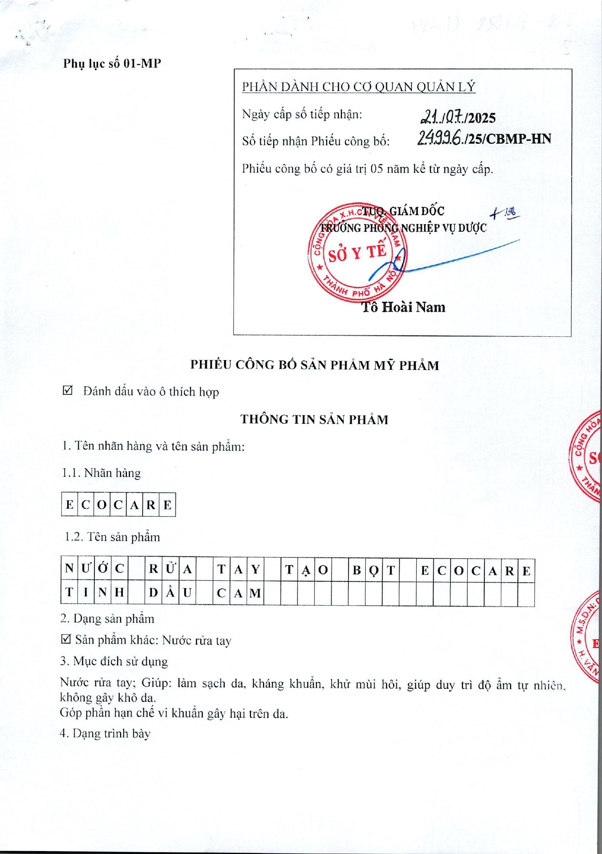 Công bố Mỹ phẩm: 24996/25/CBMP-HN (Nước rửa tay tinh dầu Cam); 24998/25/CBMP-HN (Nước rửa tay tinh dầu Quế); 24997/25/CBMP-HN (Nước rửa tay tinh dầu Nhài);