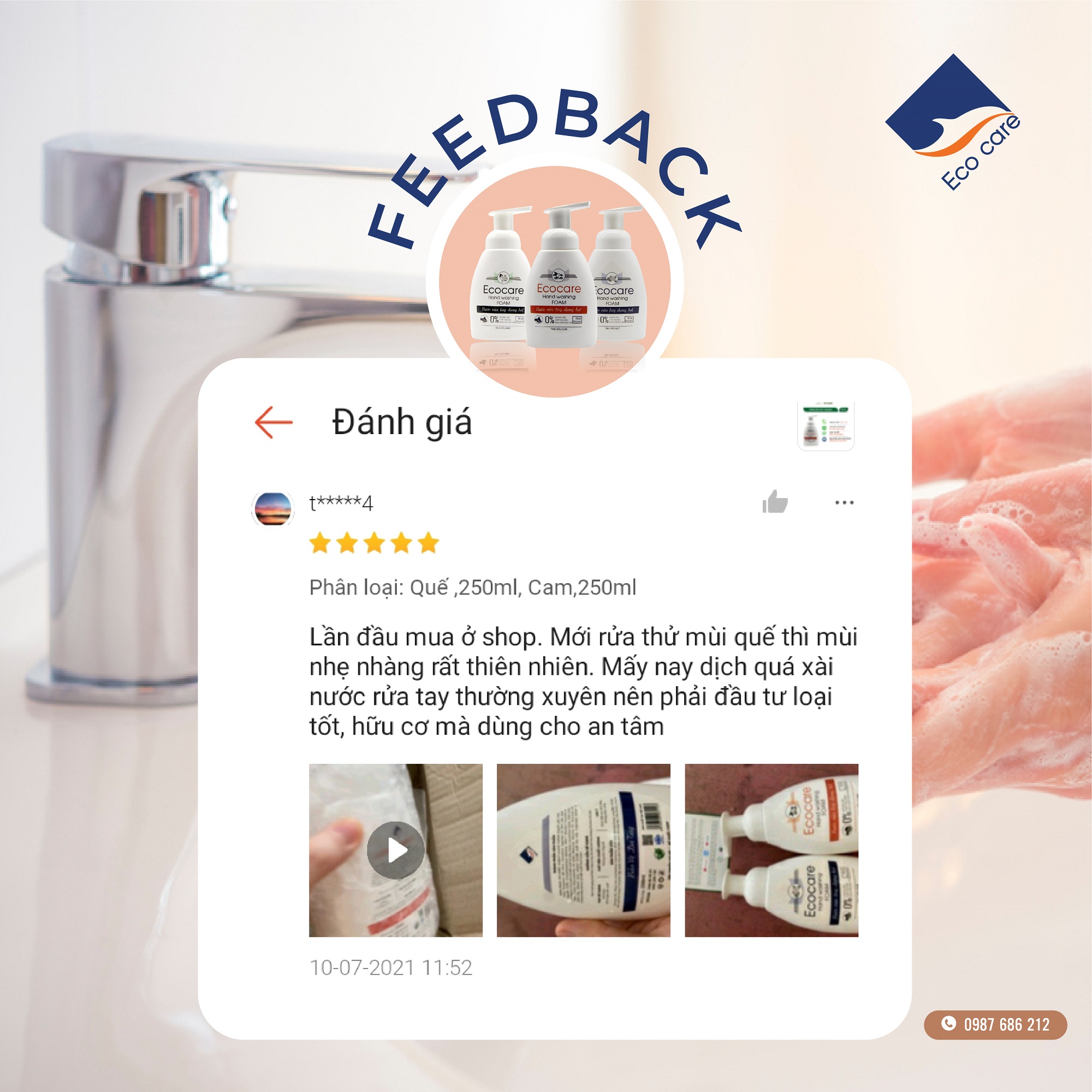 THÔNG ĐIỆP TỪ NHÀ SẢN XUẤT ECOCARE: - Trước tiên, Công ty Ecocare xin cảm ơn Quý Khách hàng đã tin tưởng lựa chọn sản phẩmNước rửa tay tạo bọt Hữu cơ 250ml, Nước
