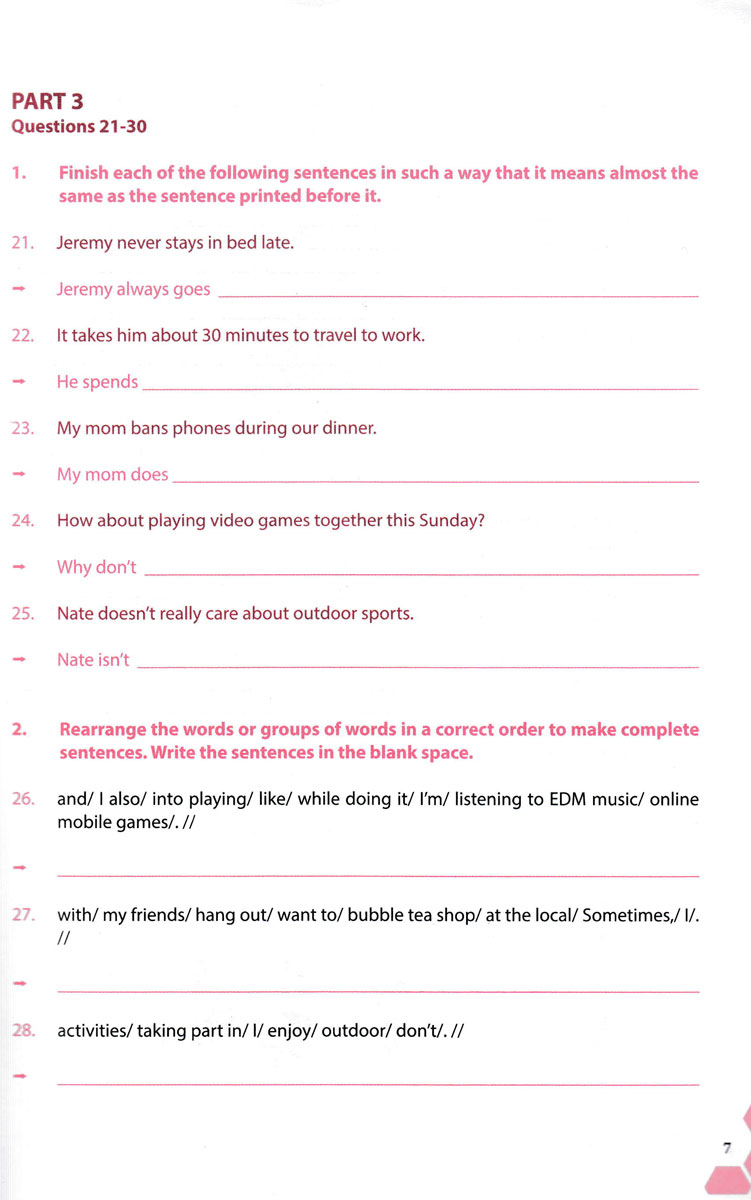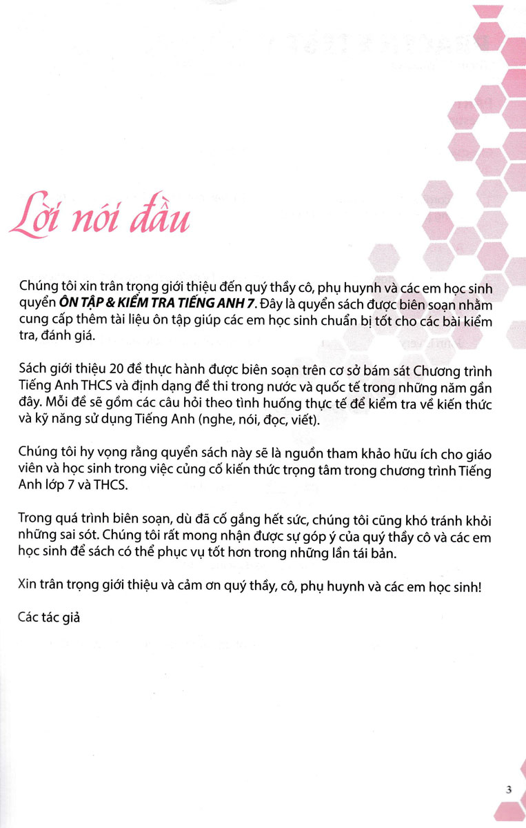 Ôn Tập & Kiểm Tra Tiếng Anh 7 (Theo Chương Trình Giáo Dục Phổ Thông 2018) Chúng tôi xin trân trọng giới thiệu đến quý thầy cô, phụ huynh và các em học sinh quyển ÔN TẬP & KIỂM TRA TIẾNG ANH 7. Đây là quyển sách được biên soạn nhằm cung cấp thêm tài liệu ôn tập giúp các em học sinh chuẩn bị tốt cho các bài kiểm tra, đánh giá. Sách giới thiệu 20 đề thực hành được biên soạn trên cơ sở bám sát Chương trình Tiếng Anh THCS và định dạng đề thi trong nước và quốc tế trong những năm gần đây. Mỗi đề sẽ gồm các câu hỏi theo tình huống thực tế để kiểm tra về kiến thức và kỹ năng sử dụng Tiếng Anh (nghe, nói, đọc, viết). Chúng tôi hy vọng rằng quyển sách này sẽ là nguồn tham khảo hữu ích cho giáo viên và học sinh trong việc củng cố kiến thức trọng tâm trong chương trình Tiếng Anh lớp 7 và THCS. Xin trân trọng giới thiệu và cảm ơn quý thầy, cô, phụ huynh và các em học sinh!
