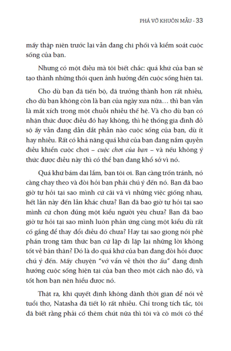 Phá Vỡ Khuôn Mẫu - Để Tự Do Sống Và Yêu Vượt qua những tổn thương thời thơ ấu Có thể bạn không nhận ra, phần lớn chúng ta khi đang ở trong một mối quan hệ tình cảm, tình bạn, hay nuôi dạy con cái thường vô thức lặp lại những khuôn mẫu đã được hình thành từ thuở bé. Thật khó mà tin được, nhưng những tổn thương từ việc bị bỏ bê, lạm dụng hay những nỗi đau được truyền lại từ cha mẹ… đều có thể tác động đến cách bạn nhìn nhận mọi thứ trong đời sống hiện tại. Trong cuốn sách “Phá vỡ khuôn mẫu” (tựa gốc: The Origins of You), tác giả Vienna Pharaon, nhà trị liệu hôn nhân và gia đình sẽ từng bước dẫn dắt bạn tìm hiểu về vết thương cội nguồn của mình. Tác giả cũng sẽ giúp bạn đi tìm nguyên nhân vì sao những câu chuyện, những mối quan hệ trong gia đình vẫn tiếp tục ảnh hưởng đến cuộc sống hiện tại và tương lai của bạn, của con cái bạn; và cách áp dụng phương pháp Chữa lành tận gốc để bạn thoát ra khỏi khuôn mẫu này. Một cô gái lúc nhỏ từng giúp cha che giấu vụ ngoại tình nên luôn nghi ngờ những mối quan hệ tình cảm của mình trong hiện tại. Một người phụ nữ bị mẹ bỏ rơi lúc năm tuổi đã tin rằng mình không xứng đáng, nên khi trưởng thành cô liên tục thử thách người yêu để có cảm giác mình là người quan trọng. Hay một chàng trai lớn lên trong hoàn cảnh không được ai tin tưởng và ủng hộ nên luôn mong muốn được bạn đời bảo vệ vô điều kiện, dẫn đến những trận cãi vã không dứt… Những câu chuyện trong “Phá vỡ khuôn mẫu” tuy đã ẩn danh tính nhân vật, nhưng vẫn vô cùng chân thật và là những câu chuyện thường thấy trong cuộc sống, bất cứ ai trong chúng ta cũng có thể gặp phải nhưng chưa biết cách giải quyết. Qua từng chương sách, Vienna Pharaon sẽ dẫn dắt chúng ta khám phá từng loại trong số các vết thương do câu chuyện cội nguồn gây ra. Đồng thời, cô cũng hướng dẫn bạn chữa lành vết thương của mình với phương pháp Chữa lành tận gốc gồm bốn bước: xác định vết thương, bằng chứng về nó, nỗi tiếc thương đi kèm với nó, và cuối cùng là thực hiện những thay đổi lâu dài để không lặp lại những khuôn mẫu mà bạn vẫn cố phá vỡ trong các mối quan hệ ở tuổi trưởng thành. Và trong các mối quan hệ, chúng ta gần như chắc chắn nhận thấy rằng mình đang lặp lại những vết thương đã trải nghiệm từ lúc nhỏ, nhưng điều đó không có nghĩa là nhất thiết phải diễn ra như vậy. Nếu có thể dừng lại một chút để tìm hiểu những vết thương này đến từ đâu, chúng ta có thể thực hiện các bước để phá vỡ lập trình đã khiến bạn mắc kẹt trong hiện tại, từ đó cải thiện đáng kể các mối quan hệ và cuộc sống của bạn trong tương lai. Như tác giả đã chỉ ra: “Khi còn bé, hẳn bạn đã nghe vô số lời khuyên hoặc khuyến khích rằng nên làm điều này thêm một chút, điều kia ít đi một chút để nhận được sự yêu thương, kết nối, công nhận, an toàn hoặc khẳng định từ cha mẹ hay người chăm sóc. Bạn có thể nhận được những lời nhắn nhủ từ cha mẹ, những thông điệp mà họ tưởng là vô hại, nhưng thật ra lại khiến bạn không còn là mình nữa… Bạn hẳn đã làm theo ý mọi người… Vì bạn được lập trình để tìm kiếm sự gắn bó. Vì gắn bó là điều cần thiết cho sự sinh tồn của bạn… Nhưng sự chân thật cũng cần thiết không kém gì nhu cầu gắn bó. Để là chính mình, bạn phải được tự do sống và cảm nhận; nghĩa là bạn phải tiết lộ toàn bộ cho chính mình và cho những người mà bạn có mối quan hệ mật thiết. Sự chân thật là gốc rễ để chúng ta tồn tại. Nếu không có nó, bạn sẽ bắt đầu chết từ bên trong”.