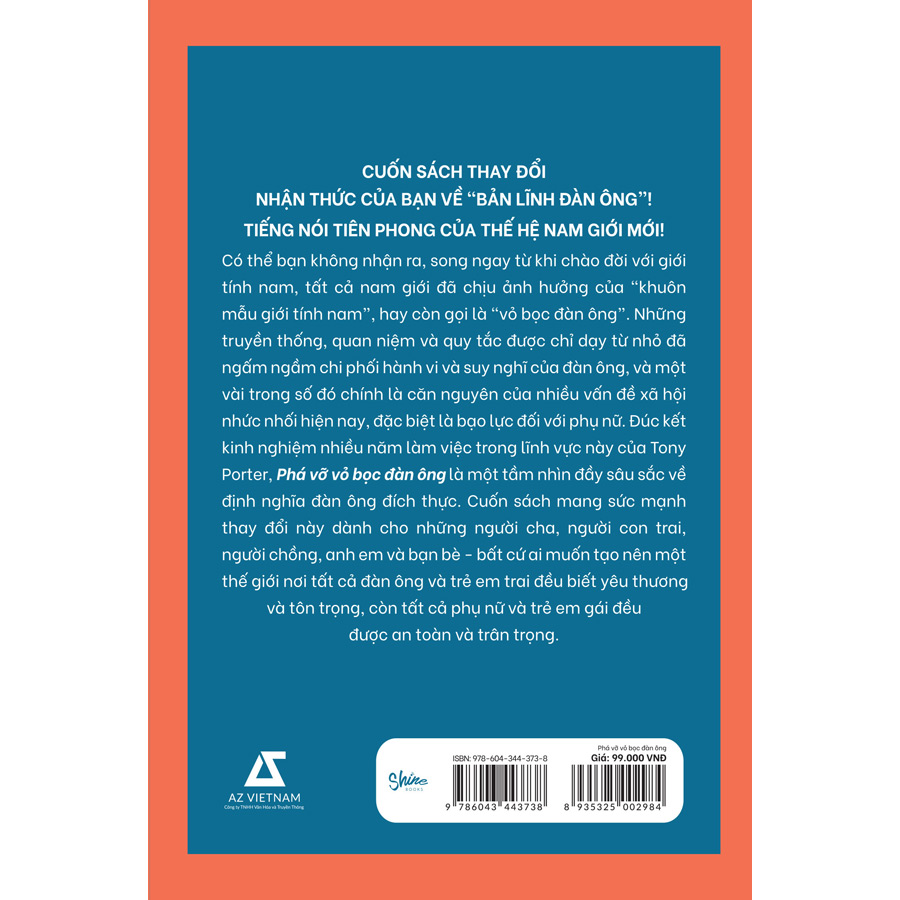 CUỐN SÁCH THAY ĐỔI NHẬN THỨC CỦA BẠN VỀ “BẢN LĨNH ĐÀN ÔNG”! TIẾNG NÓI TIÊN PHONG CỦA THẾ HỆ NAM GIỚI MỚI! Có thể bạn không nhận ra, song ngay từ khi chào đời với giới tính nam, tất cả nam giới đã chịu ảnh hưởng của “khuôn mẫu giới tính nam”, hay còn gọi là “vỏ bọc đàn ông”. Những truyền thống, quan niệm và quy tắc được chỉ dạy từ nhỏ đã ngấm ngầm chi phối hành vi và suy nghĩ của đàn ông, và một vài trong số đó chính là căn nguyên của nhiều vấn đề xã hội nhức nhối hiện nay, đặc biệt là bạo lực đối với phụ nữ. Đúc kết kinh nghiệm nhiều năm làm việc trong lĩnh vực này của Tony Porter, Phá vỡ vỏ bọc đàn ông là một tầm nhìn đầy sâu sắc về định nghĩa đàn ông đích thực. Cuốn sách mang sức mạnh thay đổi này dành cho những người cha, người con trai, người chồng, anh em và bạn bè - bất cứ ai muốn tạo nên một thế giới nơi tất cả đàn ông và trẻ em trai đều biết yêu thương và tôn trọng, còn tất cả phụ nữ và trẻ em gái đều được an toàn và trân trọng. Trích dẫn trong sách: “Đàn ông cũng cần vượt qua nỗi sợ bị tổn thương, để được sống trọn vẹn với bản chất và những điều tốt đẹp trong con người mình.” “Biến đổi xã hội đòi hỏi chúng ta phải đối diện với nỗi sợ hãi và lo lắng của bản thân trong khi tạo ra những chuẩn mực mới về cách ứng xử. Điều này đòi hỏi sự chính trực, có trách nhiệm và nhất quán trong lời nói và hành động. Chúng ta hãy cùng mong chờ tới ngày mà các quy chuẩn, thước đo về một người đàn ông đích thực sẽ không còn phụ thuộc vào thái độ hăm dọa trong ngôn từ của anh ta, sự uy hiếp toát lên từ vóc dáng, ham muốn hiển hiện trong ánh mắt hay bạo lực nhăm nhe theo từng nắm đấm nữa. Hãy cùng tin rằng ngày đó rồi sẽ đến, khi khái niệm đàn ông đích thực được định nghĩa lại theo một cách hoàn toàn khác.”