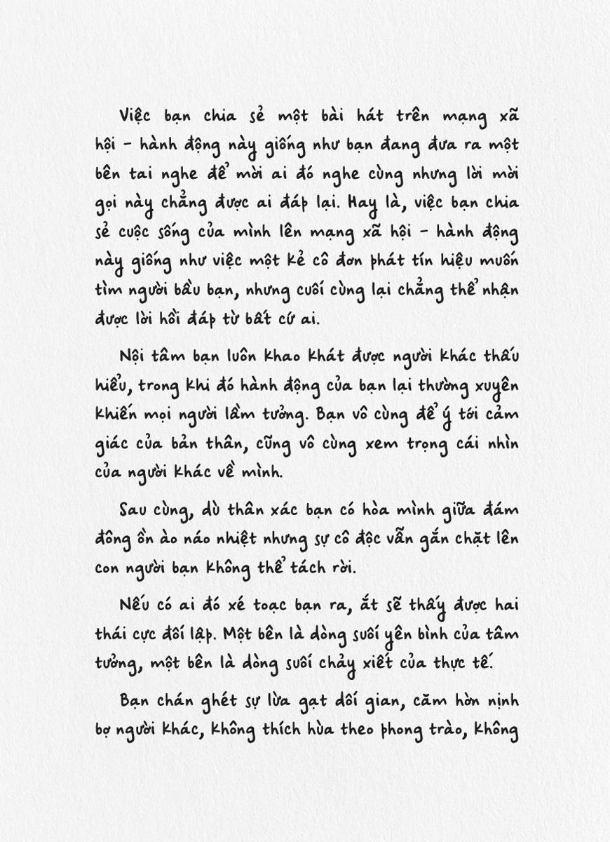 Hy vọng cuốn sách nhỏ này sẽ trở thành người đồng hành cùng bạn trong hành trình trưởng thành đầy rẫy những gian nan - nhưng cũng biết bao điều kỳ thú. Mỗi khi thấy nản chí hay mỏi mệt, hãy mở một trang sách bất kỳ, nhâm nhi từng dòng để cảm thấy trái tim của bạn được ôm ấp, vỗ về .