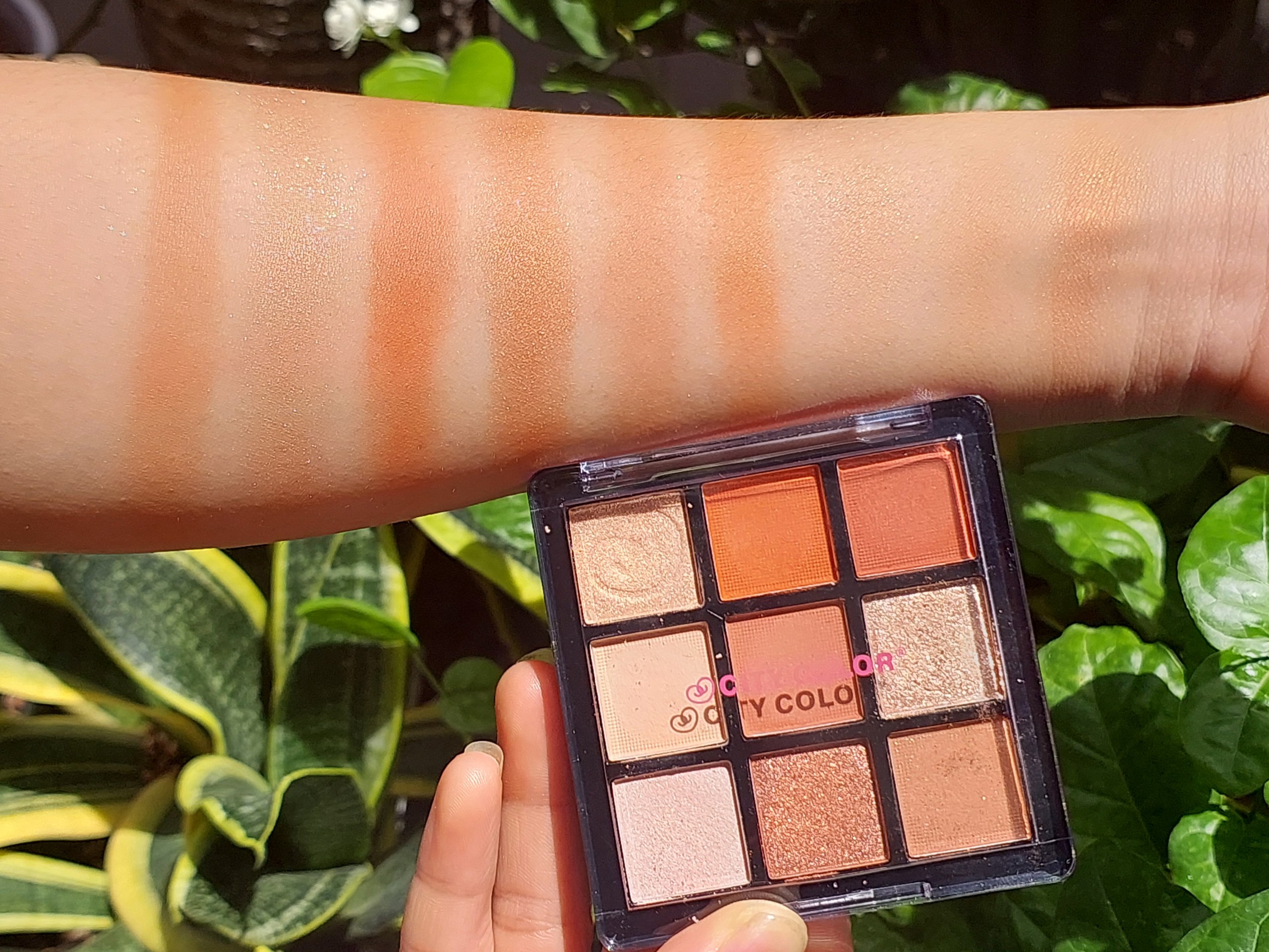 bảng màu Phấn mắt City Color Polka Dot với chín sắc thái được đánh dấu từ 1 đến 9. Bạn muốn mô tả màu sắc cho từng sắc thái trong số chín sắc thái từ trên xuống dưới trong mỗi cột. Đây là một sự cố: Cột 1: Màu 1: Màu sâm panh nhẹ với lớp nền lung linh. Màu 4: Màu cam mờ rực rỡ. Màu 7: Màu đất nung đậm. Cột 2: Màu 2: Màu be nhạt. Màu 5: Màu đào ấm áp Màu 8: Ánh vàng lấp lánh lấp lánh. Cột 3: Màu 3: Ngọc trai lung linh. Màu 6: Màu vàng hồng lấp lánh. Màu 9: Màu nâu lì mềm mại. Mỗi sắc thái đã được swatch trên cánh tay, thể hiện sắc tố và độ hoàn thiện của chúng.