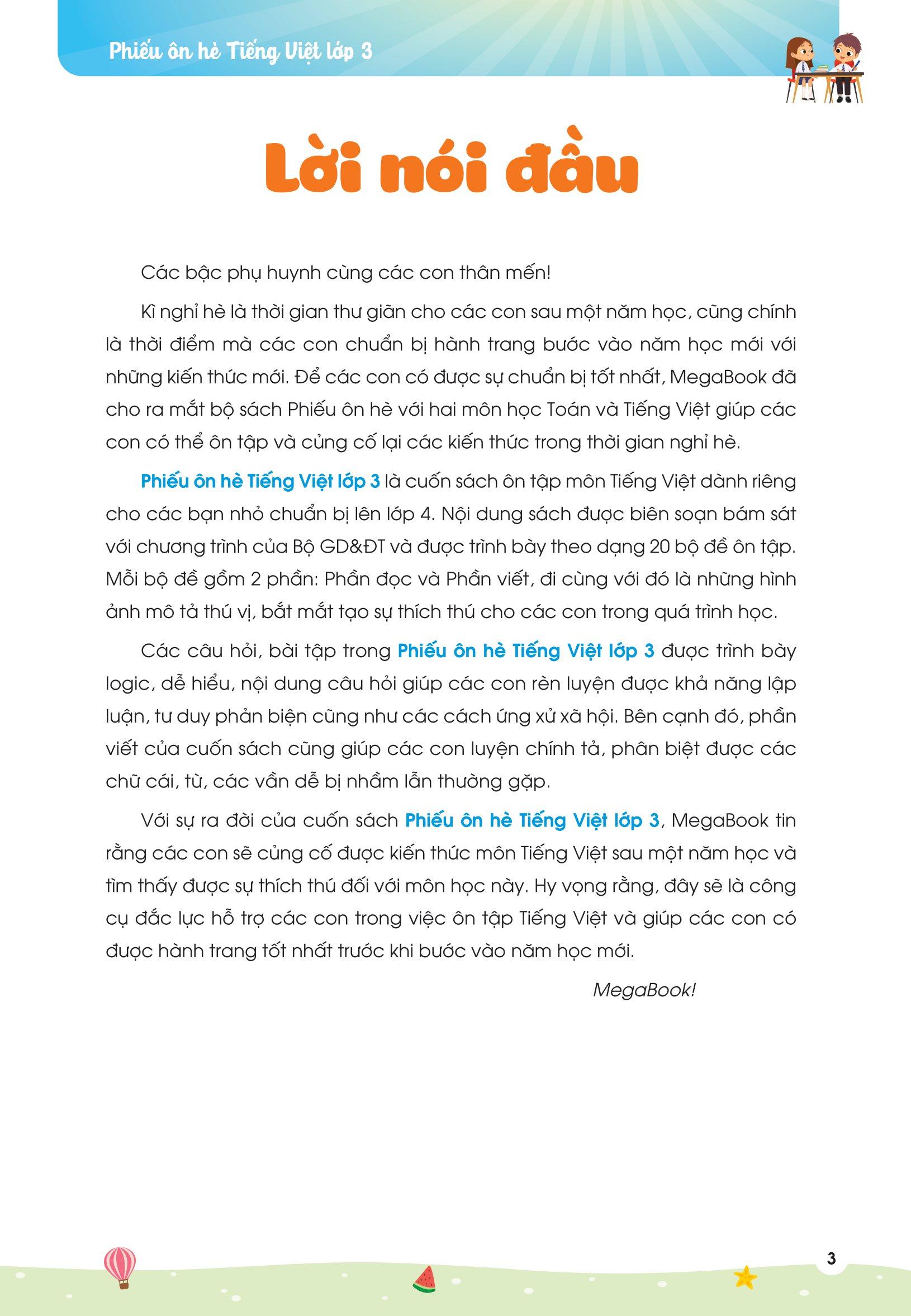 Với sự ra đời của cuốn sách Phiếu ôn hè Tiếng việt lớp 2, MegaBook tin rằng các con sẽ củng cố được kiến thức môn Tiếng việt sau một năm học và tìm thấy sự thích thú đối với môn học này. Hy vọng rằng, đây sẽ là công cụ đắc lực hỗ trợ các con trong việc ôn tập và giúp các con có được hành trang tốt nhất trước khi bước vào năm học mới.