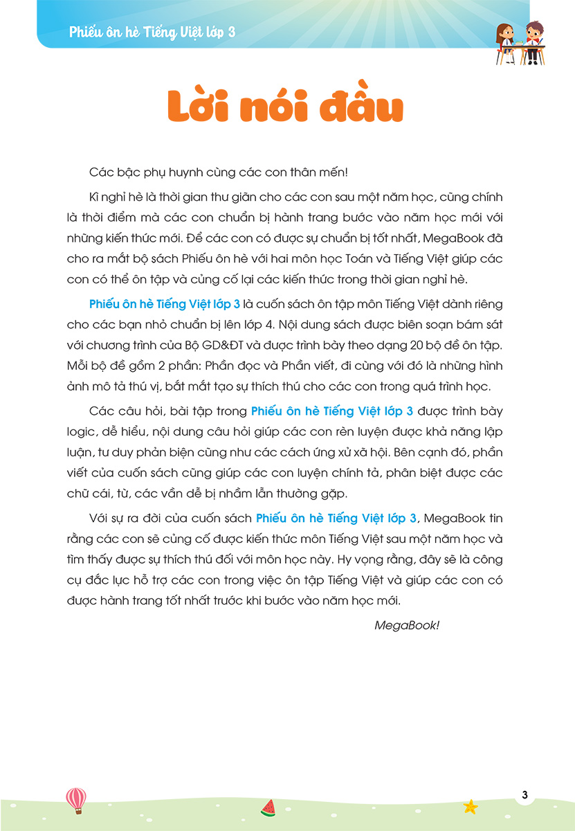 Với sự ra đời của cuốn sách Phiếu Ôn Hè Tiếng Việt Lớp 3, hy vọng rằng đây sẽ là công cụ đắc lực hỗ trợ các con trong việc ôn tập và giúp các con có được hành trang tốt nhất trước khi bước vào năm học mới.