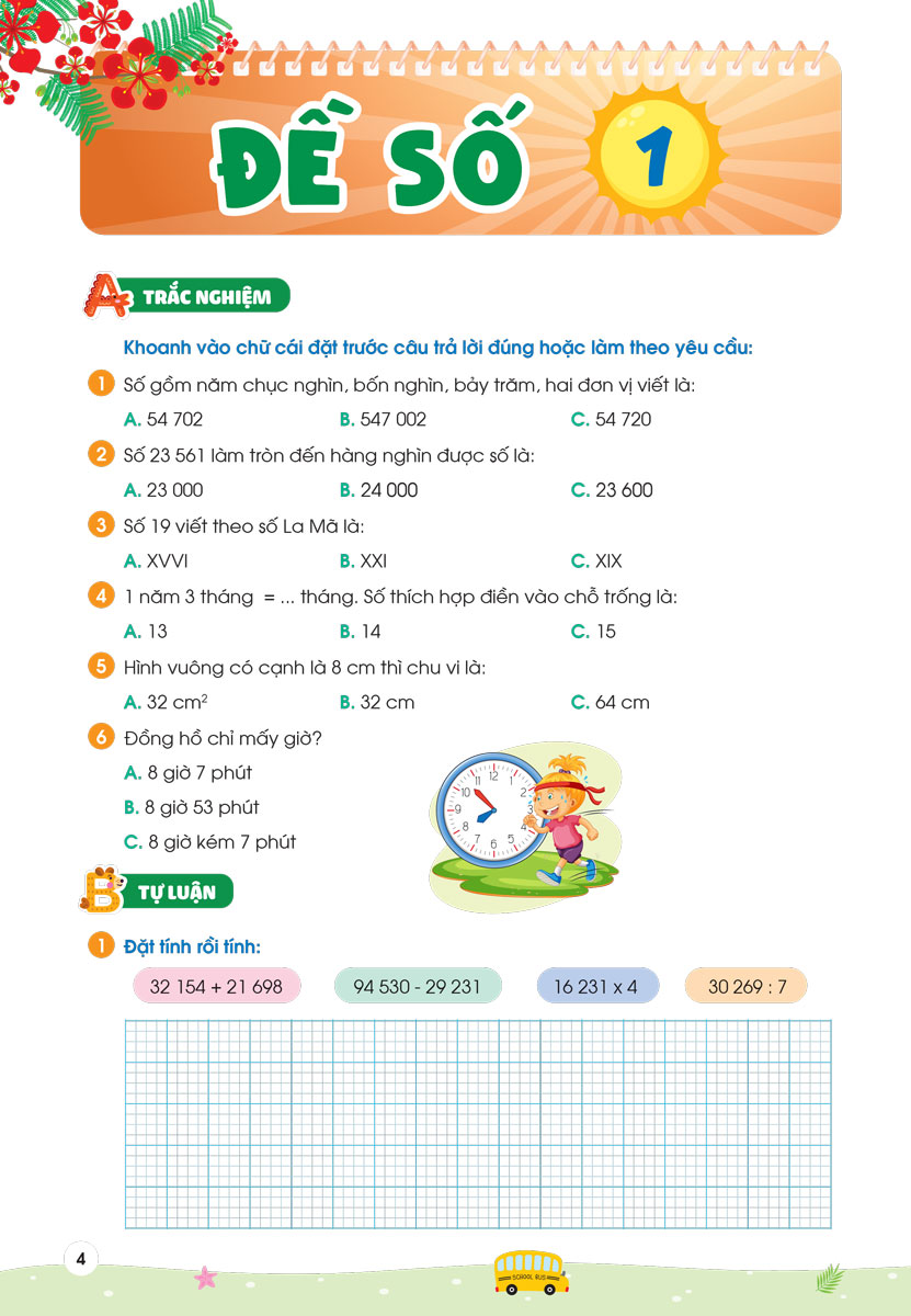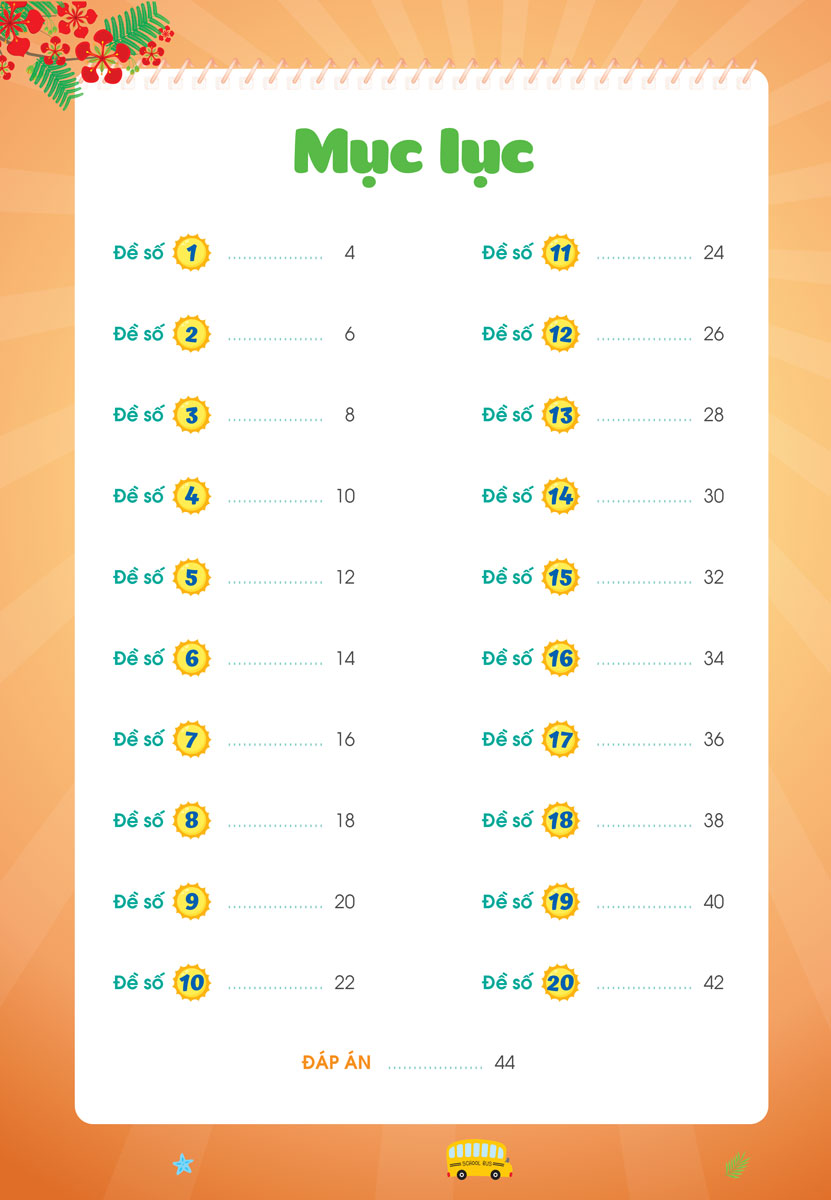Cuốn sách bao gồm 20 bộ đề, mỗi bộ đề gồm 2 phần trắc nghiệm và tự luận. Điều này giúp các em thực hành và nắm vững kiến thức thông qua các dạng bài tập khác nhau. Sự đa dạng này cũng giúp rèn luyện khả năng tư duy, suy luận và kích thích trí tưởng tượng của các em nhỏ.